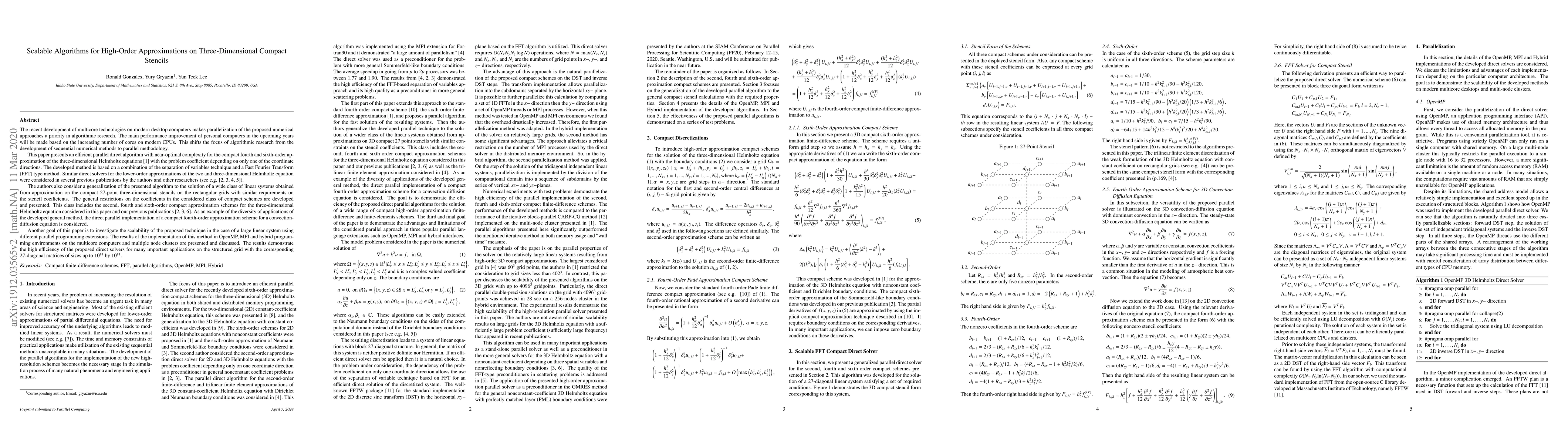 This paper presents an efficient parallel direct algorithm with near-optimal complexity for the compact fourth and sixth-order approximation of the three-dimensional Helmholtz equations [1] with the problem coefficient depending on only one of the coordinate directions. The developed method is based on a combination of the separation of variables technique and a Fast Fourier Transform (FFT) type method. Similar direct solvers for the lower-order approximations of the two and three-dimensional Helmholtz equation were considered in several previous publications by the authors and other researchers (see e.g. [2,3,4,5]). The authors also consider a generalization of the presented algorithm to the solution of a wide class of linear systems obtained from approximation on the compact 27-point three-dimensional stencils on the rectangular grids with similar requirements on the stencil coefficients. The general restrictions on the coefficients in the considered class of compact schemes are developed and presented. This class includes the second, fourth and sixth-order compact approximation schemes for the three-dimensional Helmholtz equation considered in this paper and our previous publications [2,3,6]. As an example of the diversity of applications of the developed general method, the direct parallel implementation of a compact fourth-order approximation scheme for a convection-diffusion equation is considered. The results of the implementation of this method in OpenMP, MPI and hybrid programming environments on the multicore computers and multiple node clusters are presented and discussed. The results demonstrate the high efficiency of the proposed direct solvers for many important applications on the structured grid with the corresponding 27-diagonal matrices.