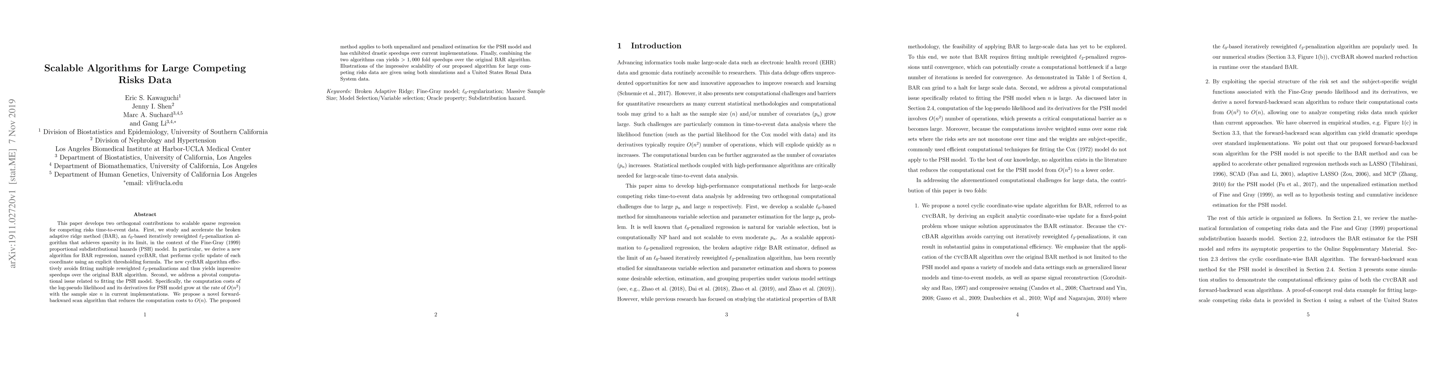 This paper introduces two novel algorithms to enhance scalability in sparse regression for competing risks data. The first, cycBAR, accelerates the broken adaptive ridge method with cyclic updates, achieving significant speedups. The second proposes a forward-backward scan algorithm to reduce computational costs from $O(n^2)$ to $O(n)$, drastically improving efficiency for the Fine-Gray proportional subdistributional hazards model. Combined, these methods offer over 1,000-fold speedups compared to the original BAR algorithm.