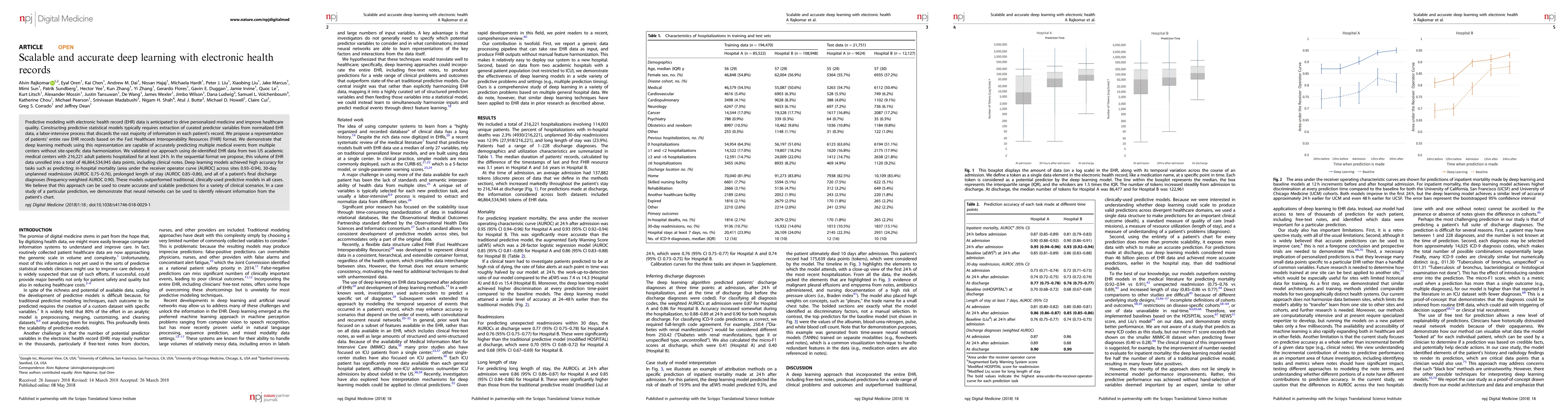 This research paper introduces a scalable deep learning approach for analyzing electronic health records, achieving high accuracy in predicting medical events such as mortality, readmission, and discharge diagnoses without requiring harmonization of data from different centers.