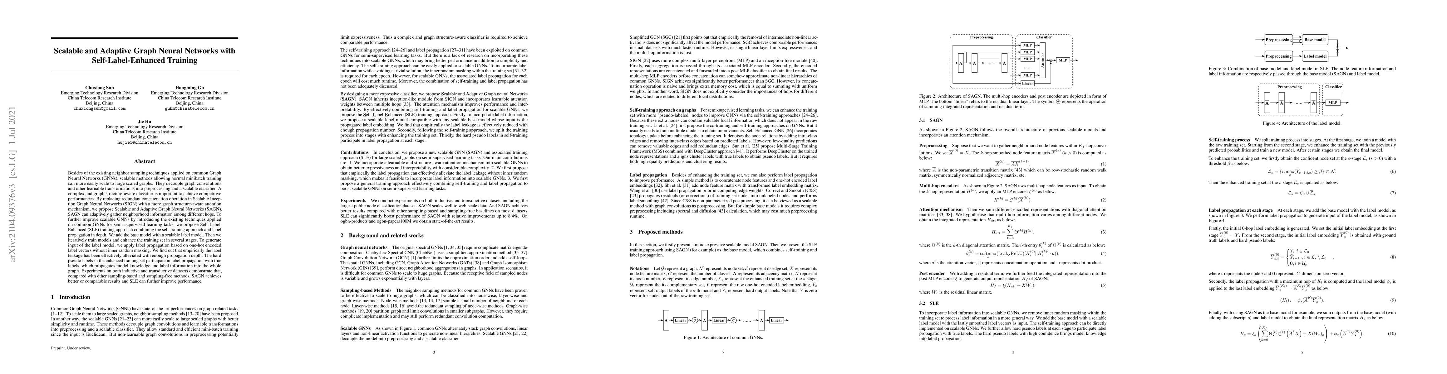 This paper proposes Scalable and Adaptive Graph Neural Networks (SAGN) that utilize an attention mechanism to efficiently gather neighborhood information across different hops, enabling scalable training on large graphs. Additionally, the Self-Label-Enhance (SLE) framework enhances semi-supervised learning by iteratively incorporating pseudo-labels generated through label propagation, achieving better or comparable results compared to other methods.