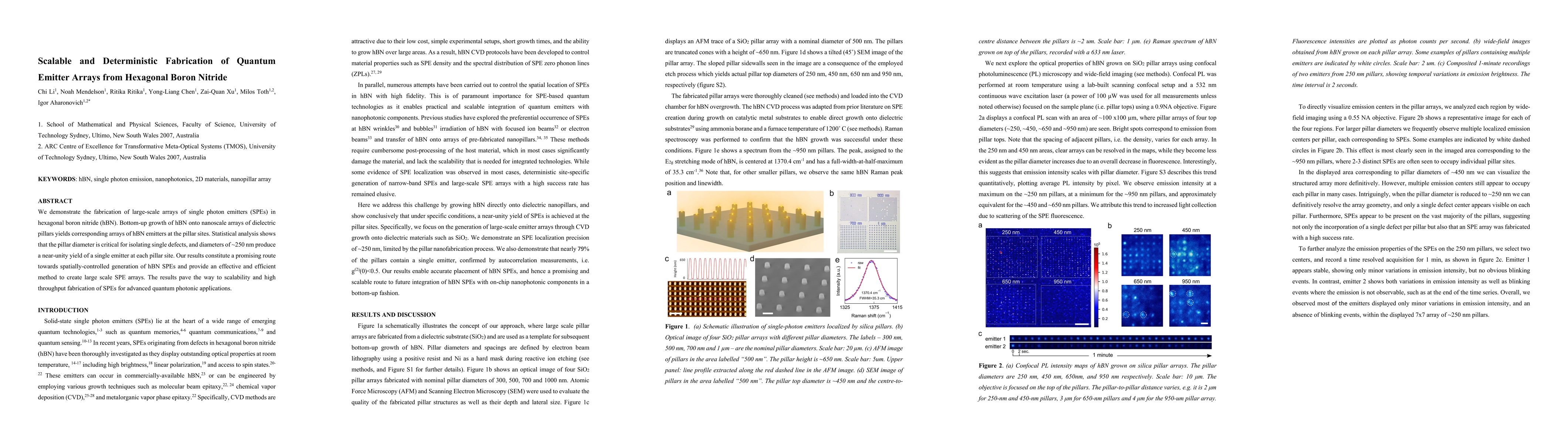 This paper presents a scalable method for fabricating large-scale arrays of single photon emitters (SPEs) in hexagonal boron nitride (hBN) using bottom-up growth on dielectric pillars. The study finds that pillar diameters of ~250 nm yield near-unity single emitter isolation, paving the way for advanced quantum photonic applications.