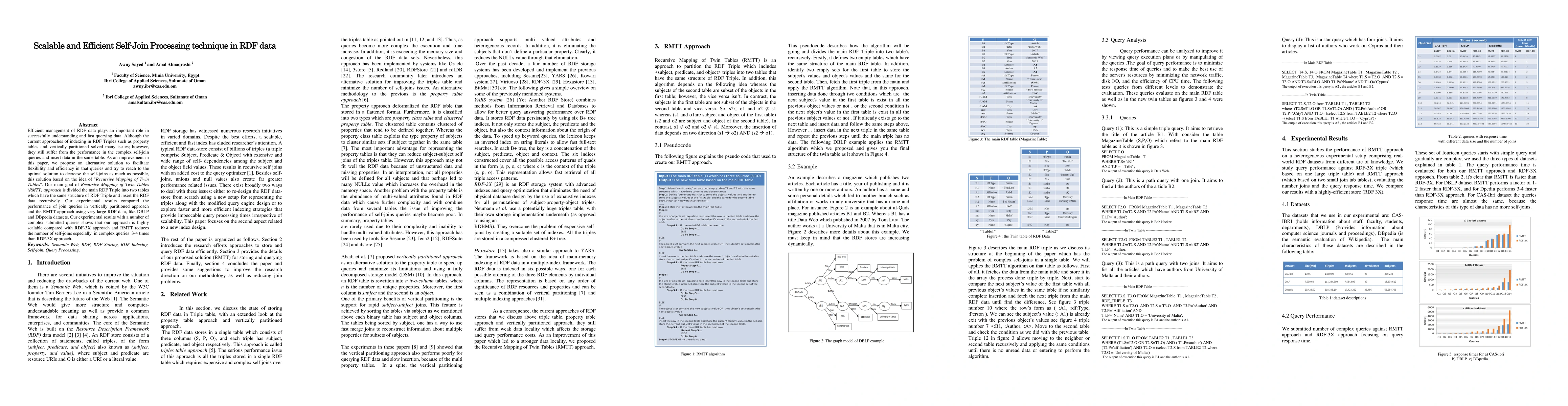 This paper proposes a "Recursive Mapping of Twin Tables" (RMTT) technique to improve the efficiency of self-join processing in RDF data, achieving better scalability and reducing self-joins by dividing RDF Triples into two structurally identical tables. Experimental results demonstrate RMTT's superior performance compared to the RDF-3X approach using large datasets like DBLP and DBpedia.