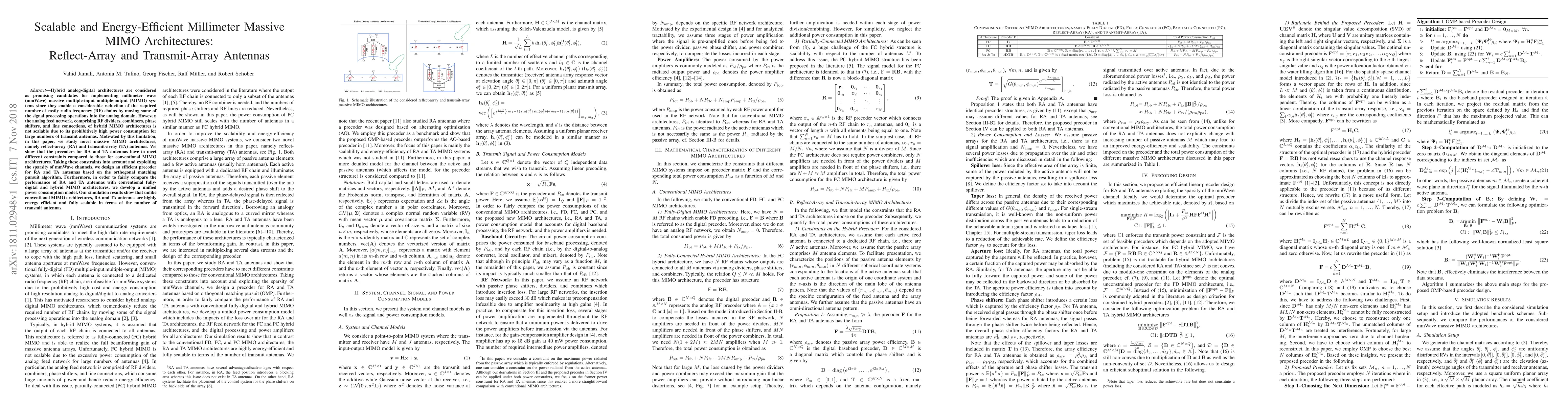 Hybrid analog-digital architectures are considered as promising candidates for implementing millimeter wave (mmWave) massive multiple-input multiple-output (MIMO) systems since they enable a considerable reduction of the required number of costly radio frequency (RF) chains by moving some of the signal processing operations into the analog domain. However, the analog feed network, comprising RF dividers, combiners, phase shifters, and line connections, of hybrid MIMO architectures is not scalable due to its prohibitively high power consumption for large numbers of transmit antennas. Motivated by this limitation, in this paper, we study novel massive MIMO architectures, namely reflect-array (RA) and transmit-array (TA) antennas. We show that the precoders for RA and TA antennas have to meet different constraints compared to those for conventional MIMO architectures. Taking these constraints into account and exploiting the sparsity of mmWave channels, we design an efficient precoder for RA and TA antennas based on the orthogonal matching pursuit algorithm. Furthermore, in order to fairly compare the performance of RA and TA antennas with conventional fully-digital and hybrid MIMO architectures, we develop a unified power consumption model. Our simulation results show that unlike conventional MIMO architectures, RA and TA antennas are highly energy efficient and fully scalable in terms of the number of transmit antennas.