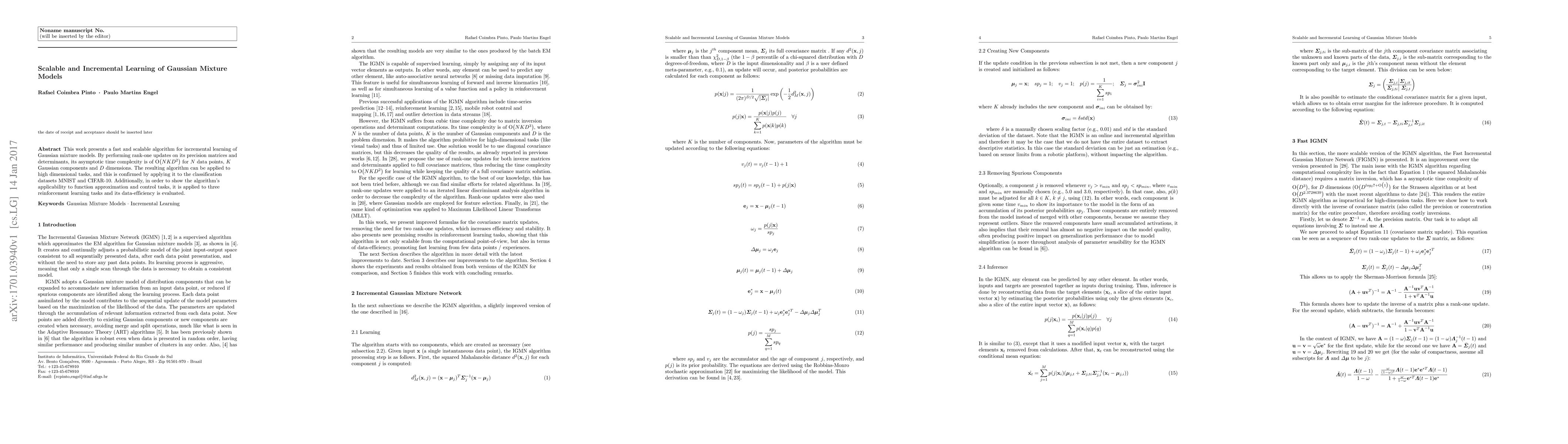 This paper introduces a scalable algorithm for incremental learning of Gaussian mixture models, achieving O(NKD²) time complexity. It demonstrates effectiveness on high-dimensional datasets like MNIST and CIFAR-10, and shows its utility in reinforcement learning tasks for function approximation and control.