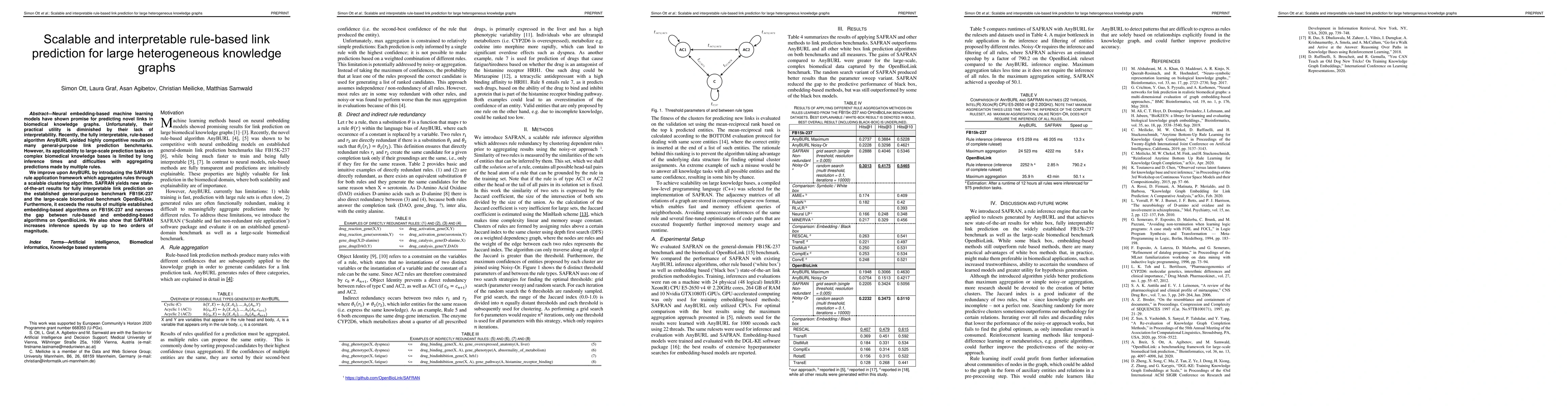 Neural embedding-based machine learning models have shown promise for predicting novel links in biomedical knowledge graphs. Unfortunately, their practical utility is diminished by their lack of interpretability. Recently, the fully interpretable, rule-based algorithm AnyBURL yielded highly competitive results on many general-purpose link prediction benchmarks. However, its applicability to large-scale prediction tasks on complex biomedical knowledge bases is limited by long inference times and difficulties with aggregating predictions made by multiple rules. We improve upon AnyBURL by introducing the SAFRAN rule application framework which aggregates rules through a scalable clustering algorithm. SAFRAN yields new state-of-the-art results for fully interpretable link prediction on the established general-purpose benchmark FB15K-237 and the large-scale biomedical benchmark OpenBioLink. Furthermore, it exceeds the results of multiple established embedding-based algorithms on FB15K-237 and narrows the gap between rule-based and embedding-based algorithms on OpenBioLink. We also show that SAFRAN increases inference speeds by up to two orders of magnitude.