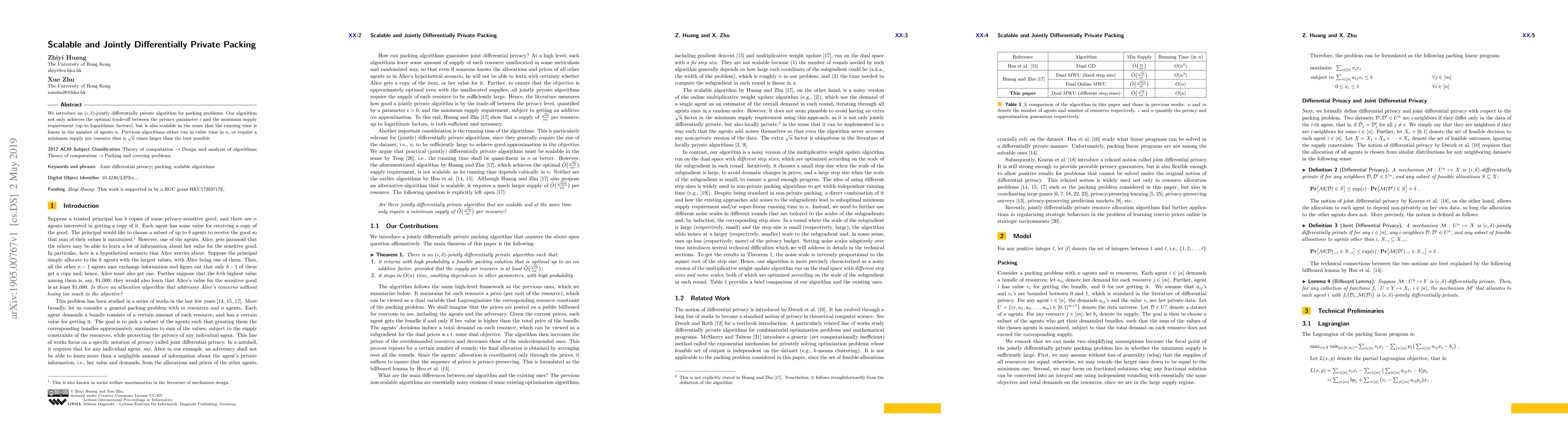 We introduce an $(\epsilon, \delta)$-jointly differentially private algorithm for packing problems. Our algorithm not only achieves the optimal trade-off between the privacy parameter $\epsilon$ and the minimum supply requirement (up to logarithmic factors), but is also scalable in the sense that the running time is linear in the number of agents $n$. Previous algorithms either run in cubic time in $n$, or require a minimum supply per resource that is $\sqrt{n}$ times larger than the best possible.