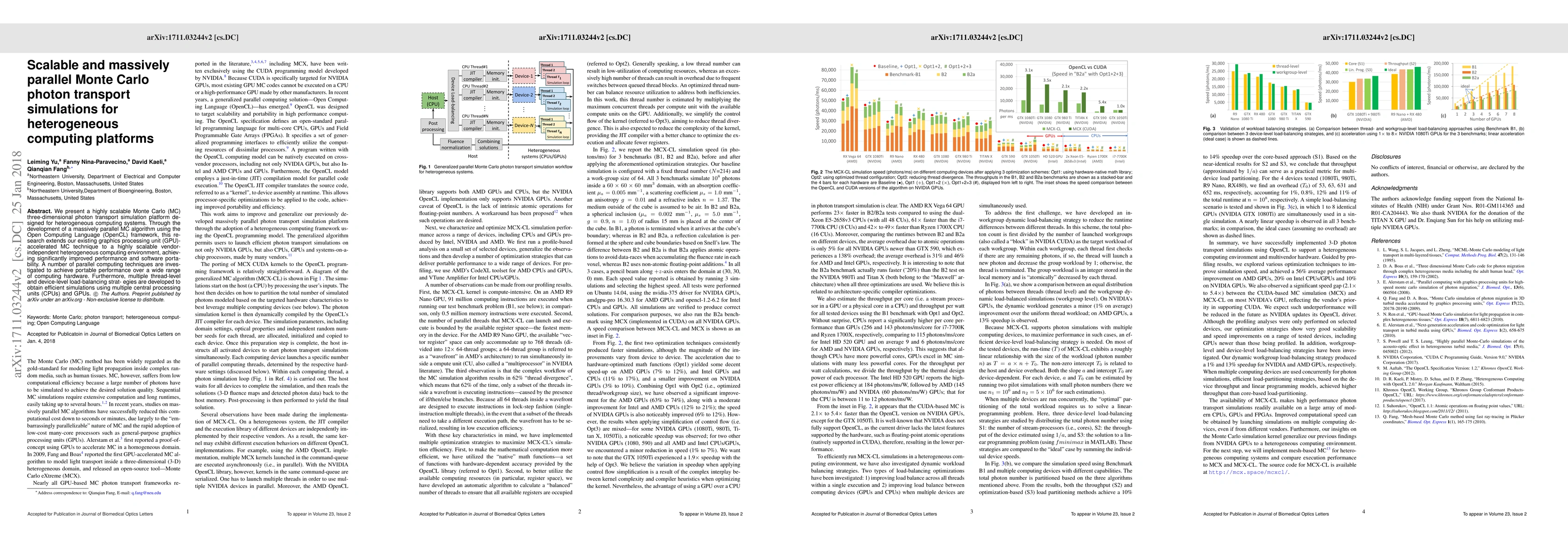 This research develops a scalable, massively parallel Monte Carlo simulation platform for heterogeneous computing systems, utilizing the OpenCL framework to enhance performance and portability. The study employs advanced parallel computing and load-balancing strategies to efficiently utilize both CPUs and GPUs.