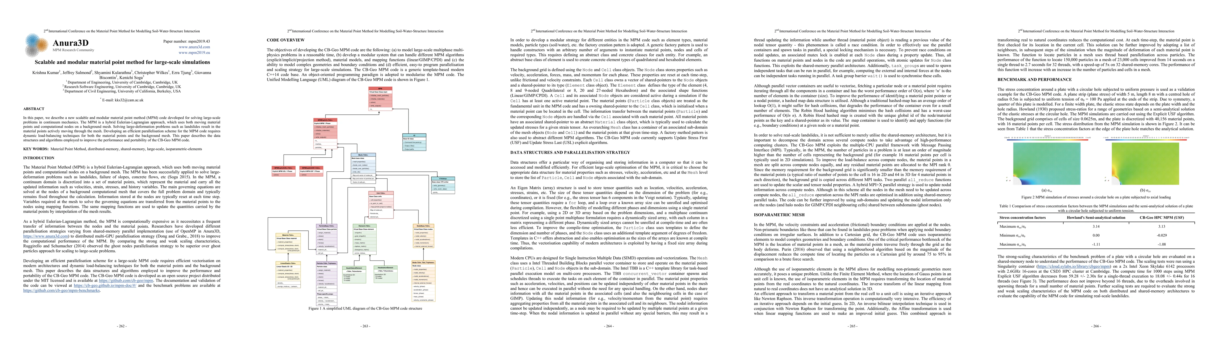 In this paper, we describe a new scalable and modular material point method (MPM) code developed for solving large-scale problems in continuum mechanics. The MPM is a hybrid Eulerian-Lagrangian approach, which uses both moving material points and computational nodes on a background mesh. The MPM has been successfully applied to solve large-deformation problems such as landslides, failure of slopes, concrete flows, etc. Solving these large-deformation problems result in the material points actively moving through the mesh. Developing an efficient parallelisation scheme for the MPM code requires dynamic load-balancing techniques for both the material points and the background mesh. This paper describes the data structures and algorithms employed to improve the performance and portability of the MPM code. An object-oriented programming paradigm is adopted to modularise the MPM code. The Unified Modelling Language (UML) diagram of the MPM code structure is shown in Figure 1.