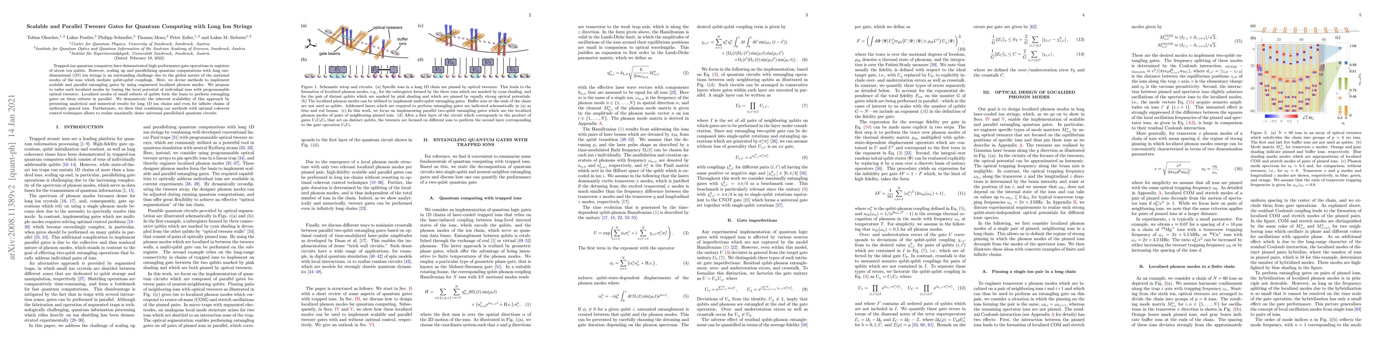 Trapped-ion quantum computers have demonstrated high-performance gate operations in registers of about ten qubits. However, scaling up and parallelizing quantum computations with long one-dimensional (1D) ion strings is an outstanding challenge due to the global nature of the motional modes of the ions which mediate qubit-qubit couplings. Here, we devise methods to implement scalable and parallel entangling gates by using engineered localized phonon modes. We propose to tailor such localized modes by tuning the local potential of individual ions with programmable optical tweezers. Localized modes of small subsets of qubits form the basis to perform entangling gates on these subsets in parallel. We demonstrate the inherent scalability of this approach by presenting analytical and numerical results for long 1D ion chains and even for infinite chains of uniformly spaced ions. Furthermore, we show that combining our methods with optimal coherent control techniques allows to realize maximally dense universal parallelized quantum circuits.