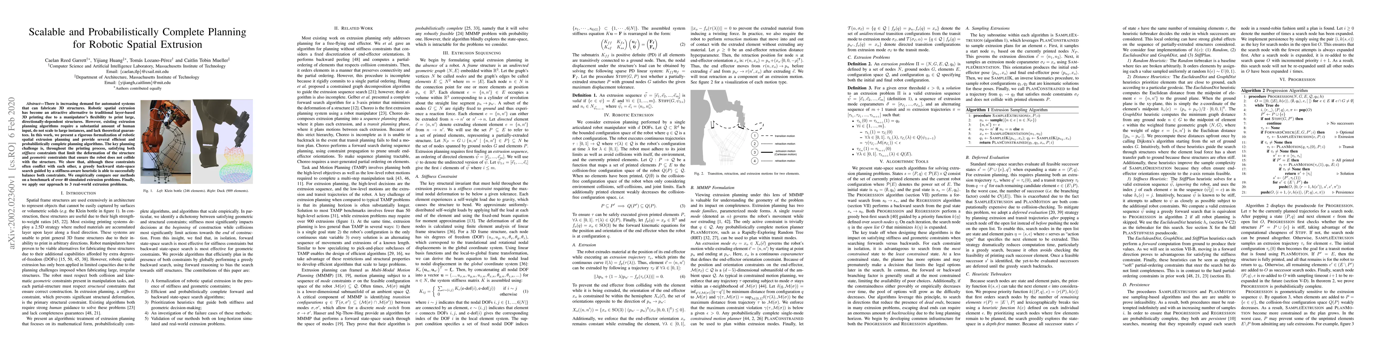 There is increasing demand for automated systems that can fabricate 3D structures. Robotic spatial extrusion has become an attractive alternative to traditional layer-based 3D printing due to a manipulator's flexibility to print large, directionally-dependent structures. However, existing extrusion planning algorithms require a substantial amount of human input, do not scale to large instances, and lack theoretical guarantees. In this work, we present a rigorous formalization of robotic spatial extrusion planning and provide several efficient and probabilistically complete planning algorithms. The key planning challenge is, throughout the printing process, satisfying both stiffness constraints that limit the deformation of the structure and geometric constraints that ensure the robot does not collide with the structure. We show that, although these constraints often conflict with each other, a greedy backward state-space search guided by a stiffness-aware heuristic is able to successfully balance both constraints. We empirically compare our methods on a benchmark of over 40 simulated extrusion problems. Finally, we apply our approach to 3 real-world extrusion problems.