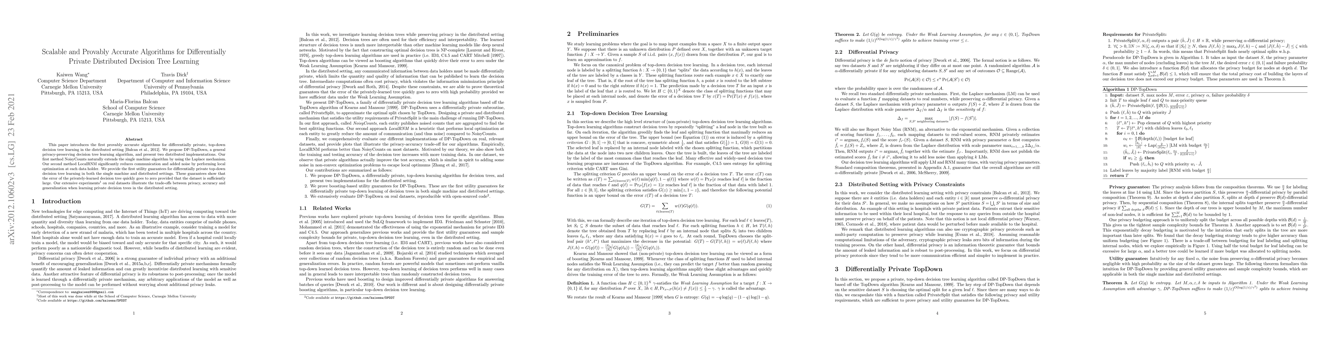 This paper presents scalable algorithms for differentially private decision tree learning in distributed settings, including DP-TopDown, NoisyCounts, and LocalRNM. It provides provable accuracy guarantees and explores trade-offs between privacy, accuracy, and generalization through experiments on real datasets.