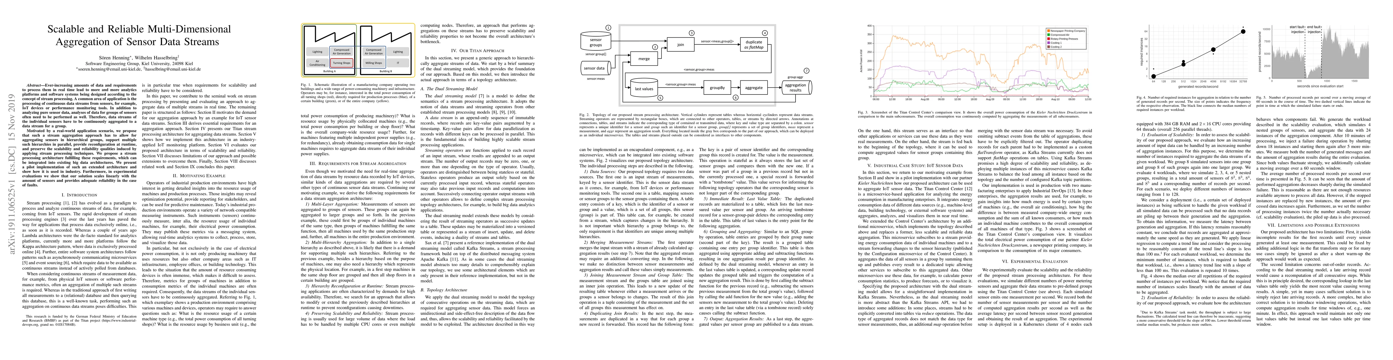 Ever-increasing amounts of data and requirements to process them in real time lead to more and more analytics platforms and software systems being designed according to the concept of stream processing. A common area of application is the processing of continuous data streams from sensors, for example, IoT devices or performance monitoring tools. In addition to analyzing pure sensor data, analyses of data for groups of sensors often need to be performed as well. Therefore, data streams of the individual sensors have to be continuously aggregated to a data stream for a group. Motivated by a real-world application scenario, we propose that such a stream aggregation approach has to allow for aggregating sensors in hierarchical groups, support multiple such hierarchies in parallel, provide reconfiguration at runtime, and preserve the scalability and reliability qualities induced by applying stream processing techniques. We propose a stream processing architecture fulfilling these requirements, which can be integrated into existing big data architectures. We present a pilot implementation of such an extended architecture and show how it is used in industry. Furthermore, in experimental evaluations we show that our solution scales linearly with the amount of sensors and provides adequate reliability in the case of faults.