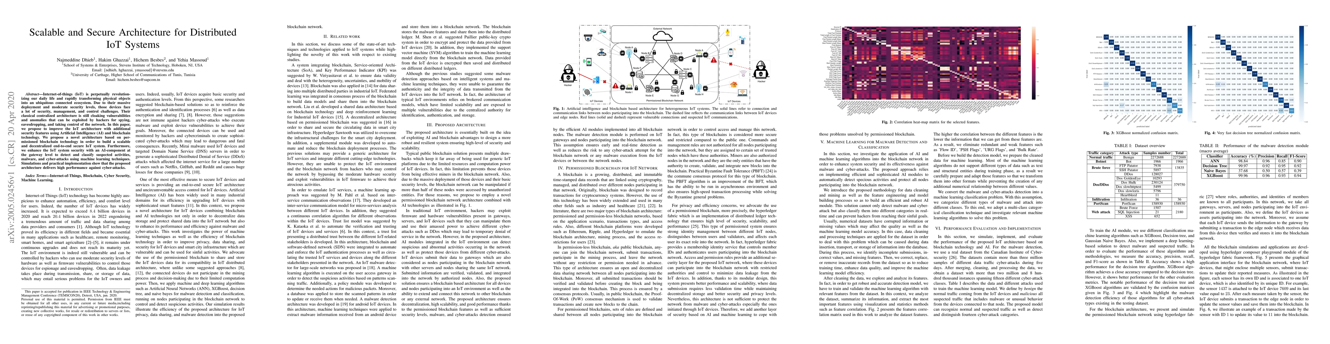 This paper proposes a scalable and secure architecture for distributed IoT systems using blockchain and AI. It introduces a permissioned blockchain for decentralized security and an AI-based gateway for detecting and classifying cyber-attacks, demonstrating high performance in simulations and practical implementations.