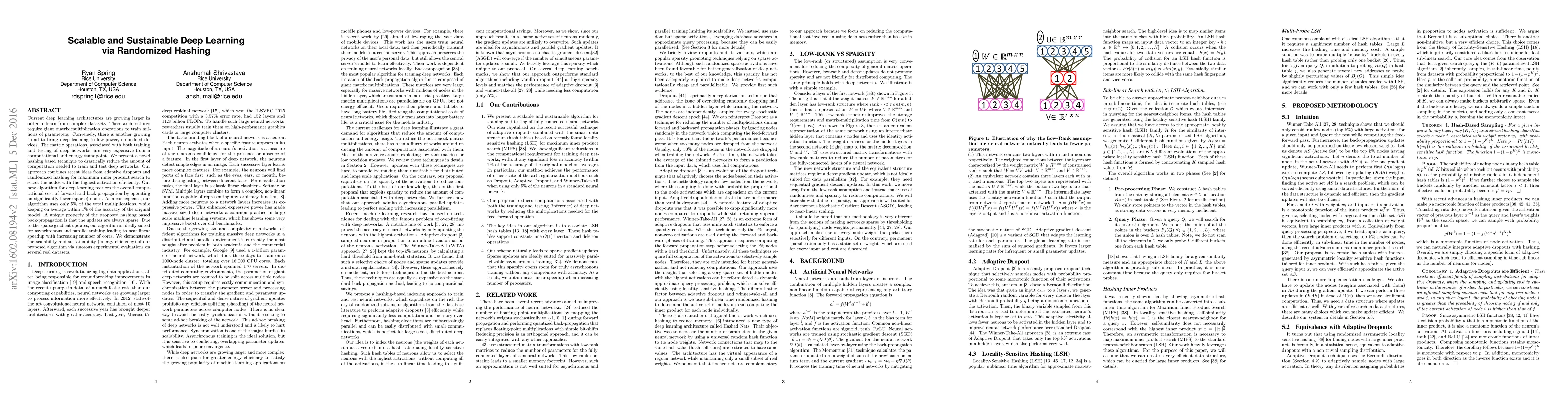 Current deep learning architectures are growing larger in order to learn from complex datasets. These architectures require giant matrix multiplication operations to train millions of parameters. Conversely, there is another growing trend to bring deep learning to low-power, embedded devices. The matrix operations, associated with both training and testing of deep networks, are very expensive from a computational and energy standpoint. We present a novel hashing based technique to drastically reduce the amount of computation needed to train and test deep networks. Our approach combines recent ideas from adaptive dropouts and randomized hashing for maximum inner product search to select the nodes with the highest activation efficiently. Our new algorithm for deep learning reduces the overall computational cost of forward and back-propagation by operating on significantly fewer (sparse) nodes. As a consequence, our algorithm uses only 5% of the total multiplications, while keeping on average within 1% of the accuracy of the original model. A unique property of the proposed hashing based back-propagation is that the updates are always sparse. Due to the sparse gradient updates, our algorithm is ideally suited for asynchronous and parallel training leading to near linear speedup with increasing number of cores. We demonstrate the scalability and sustainability (energy efficiency) of our proposed algorithm via rigorous experimental evaluations on several real datasets.