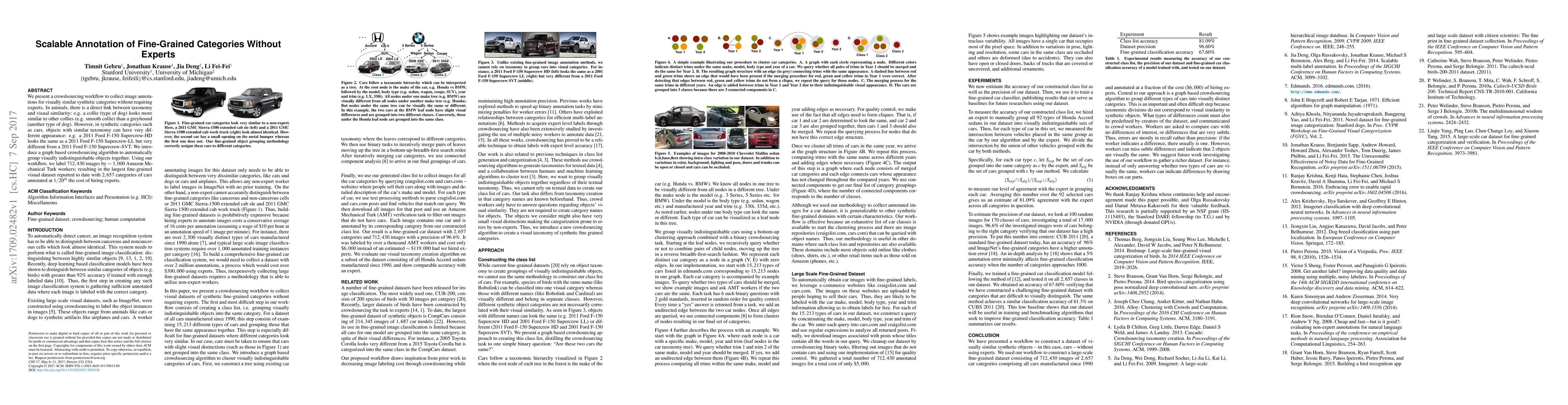 We present a crowdsourcing workflow to collect image annotations for visually similar synthetic categories without requiring experts. In animals, there is a direct link between taxonomy and visual similarity: e.g. a collie (type of dog) looks more similar to other collies (e.g. smooth collie) than a greyhound (another type of dog). However, in synthetic categories such as cars, objects with similar taxonomy can have very different appearance: e.g. a 2011 Ford F-150 Supercrew-HD looks the same as a 2011 Ford F-150 Supercrew-LL but very different from a 2011 Ford F-150 Supercrew-SVT. We introduce a graph based crowdsourcing algorithm to automatically group visually indistinguishable objects together. Using our workflow, we label 712,430 images by ~1,000 Amazon Mechanical Turk workers; resulting in the largest fine-grained visual dataset reported to date with 2,657 categories of cars annotated at 1/20th the cost of hiring experts.