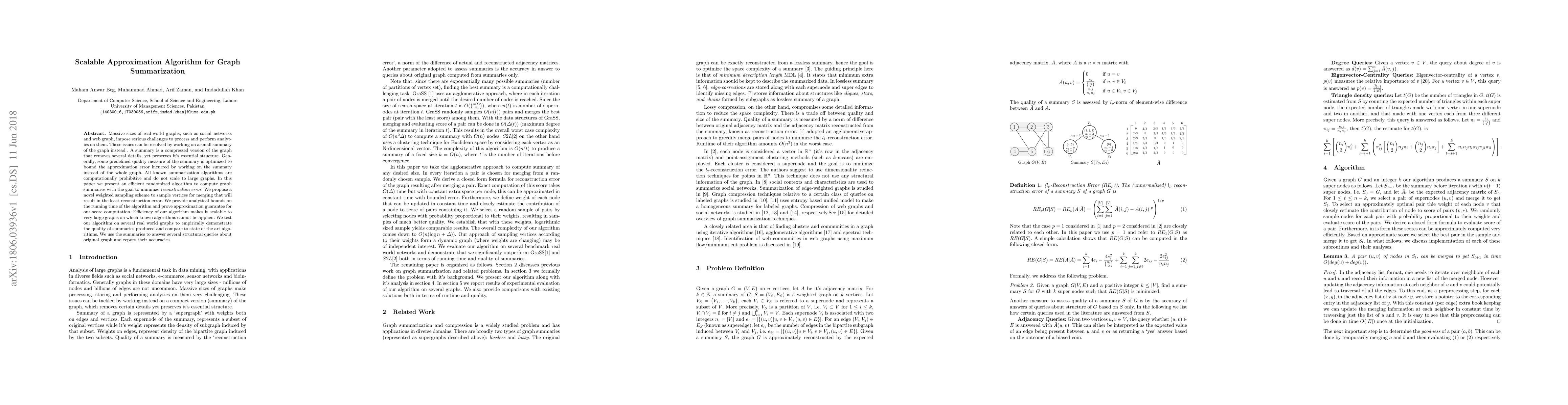 This paper introduces an efficient, scalable randomized algorithm for graph summarization, minimizing reconstruction error. It proposes a novel weighted sampling scheme for vertex selection and provides analytical bounds on running time and approximation guarantee. Empirical testing on real-world graphs demonstrates the quality of produced summaries and their use in answering structural queries.