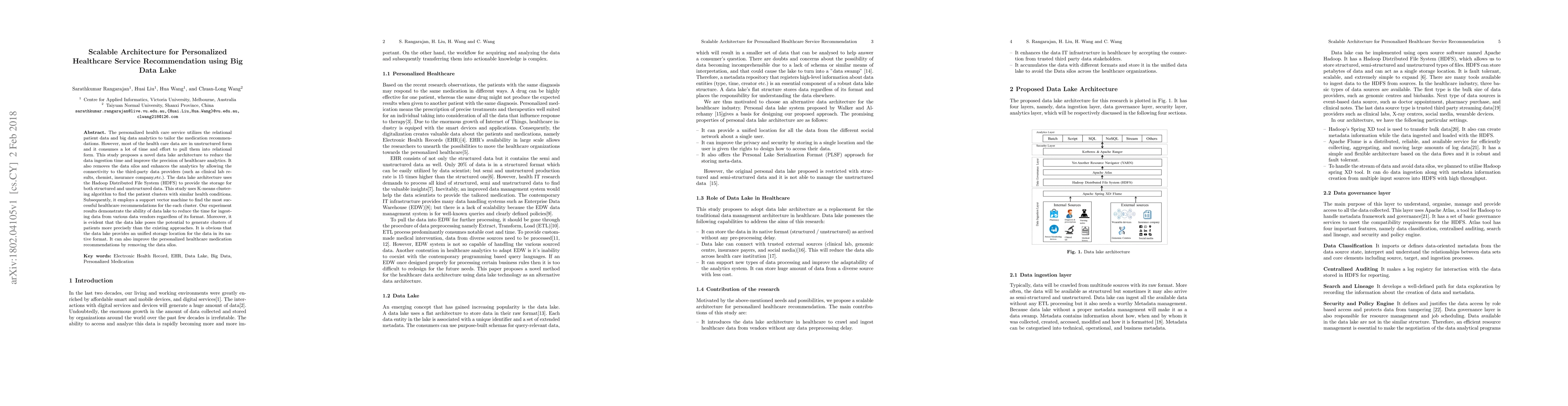 The personalized health care service utilizes the relational patient data and big data analytics to tailor the medication recommendations. However, most of the health care data are in unstructured form and it consumes a lot of time and effort to pull them into relational form. This study proposes a novel data lake architecture to reduce the data ingestion time and improve the precision of healthcare analytics. It also removes the data silos and enhances the analytics by allowing the connectivity to the third-party data providers (such as clinical lab results, chemist, insurance company,etc.). The data lake architecture uses the Hadoop Distributed File System (HDFS) to provide the storage for both structured and unstructured data. This study uses K-means clustering algorithm to find the patient clusters with similar health conditions. Subsequently, it employs a support vector machine to find the most successful healthcare recommendations for the each cluster. Our experiment results demonstrate the ability of data lake to reduce the time for ingesting data from various data vendors regardless of its format. Moreover, it is evident that the data lake poses the potential to generate clusters of patients more precisely than the existing approaches. It is obvious that the data lake provides a unified storage location for the data in its native format. It can also improve the personalized healthcare medication recommendations by removing the data silos.