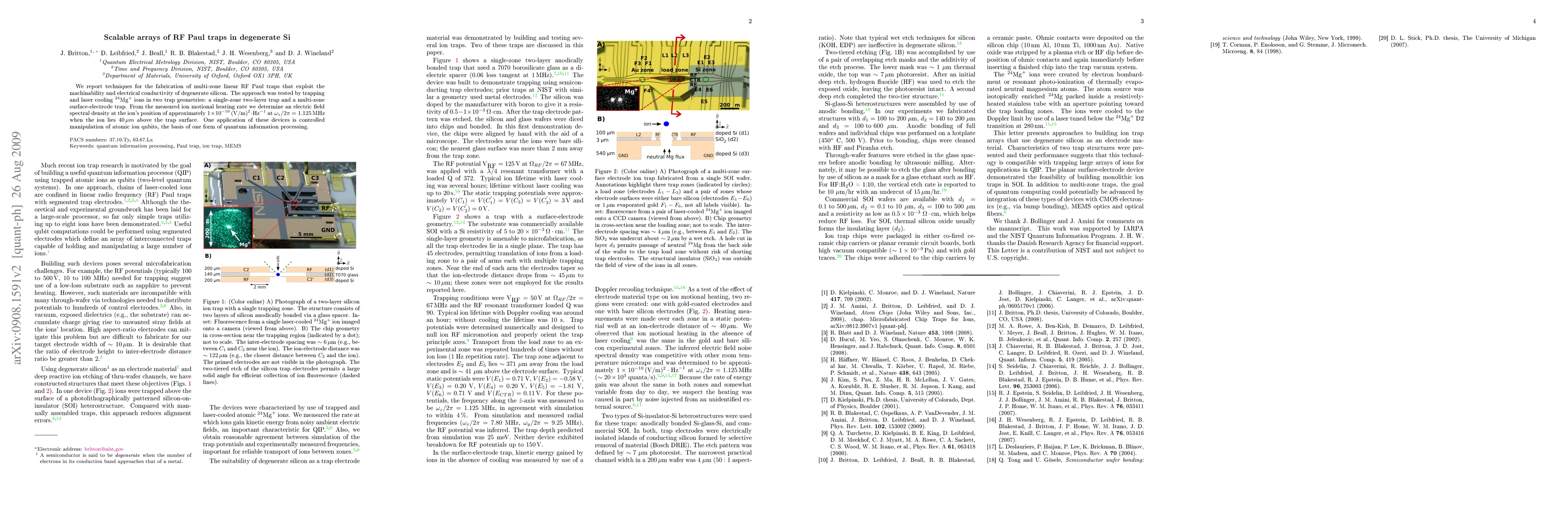 This paper details the fabrication of scalable RF Paul traps using degenerate silicon for trapping and laser cooling of 24Mg+ ions. The study demonstrates the effectiveness of single-zone and multi-zone traps, achieving an electric field spectral density of 1E-10 (V/m)^2/Hz at 1.125 MHz, paving the way for quantum information processing through atomic ion qubit manipulation.