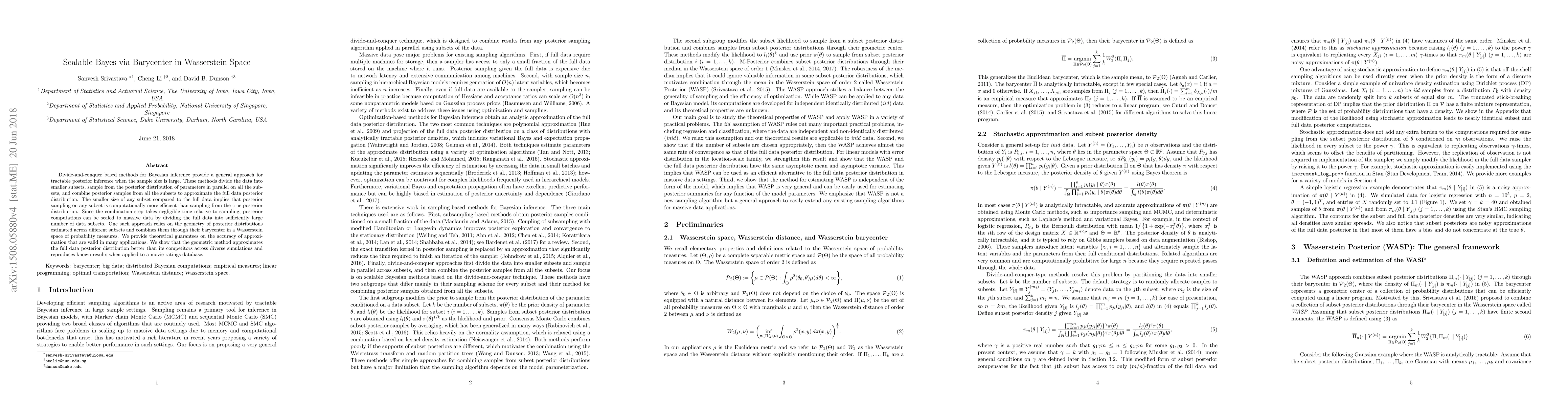 This paper introduces a method for scalable Bayesian inference using the barycenter in Wasserstein space, which accurately approximates large data posterior distributions with negligible computational overhead.