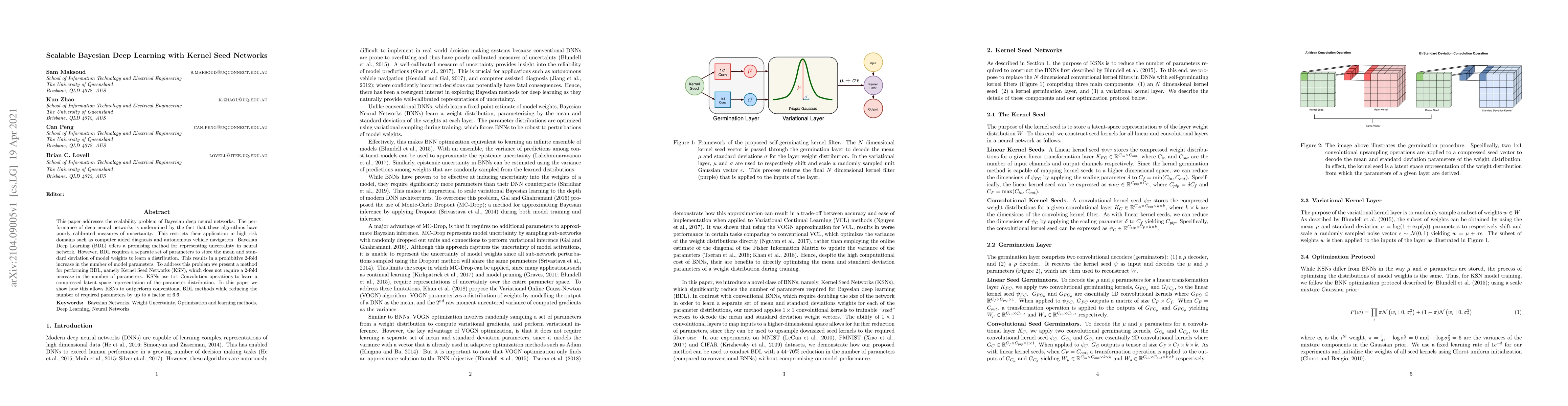 This paper addresses the scalability problem of Bayesian deep neural networks. The performance of deep neural networks is undermined by the fact that these algorithms have poorly calibrated measures of uncertainty. This restricts their application in high risk domains such as computer aided diagnosis and autonomous vehicle navigation. Bayesian Deep Learning (BDL) offers a promising method for representing uncertainty in neural network. However, BDL requires a separate set of parameters to store the mean and standard deviation of model weights to learn a distribution. This results in a prohibitive 2-fold increase in the number of model parameters. To address this problem we present a method for performing BDL, namely Kernel Seed Networks (KSN), which does not require a 2-fold increase in the number of parameters. KSNs use 1x1 Convolution operations to learn a compressed latent space representation of the parameter distribution. In this paper we show how this allows KSNs to outperform conventional BDL methods while reducing the number of required parameters by up to a factor of 6.6.