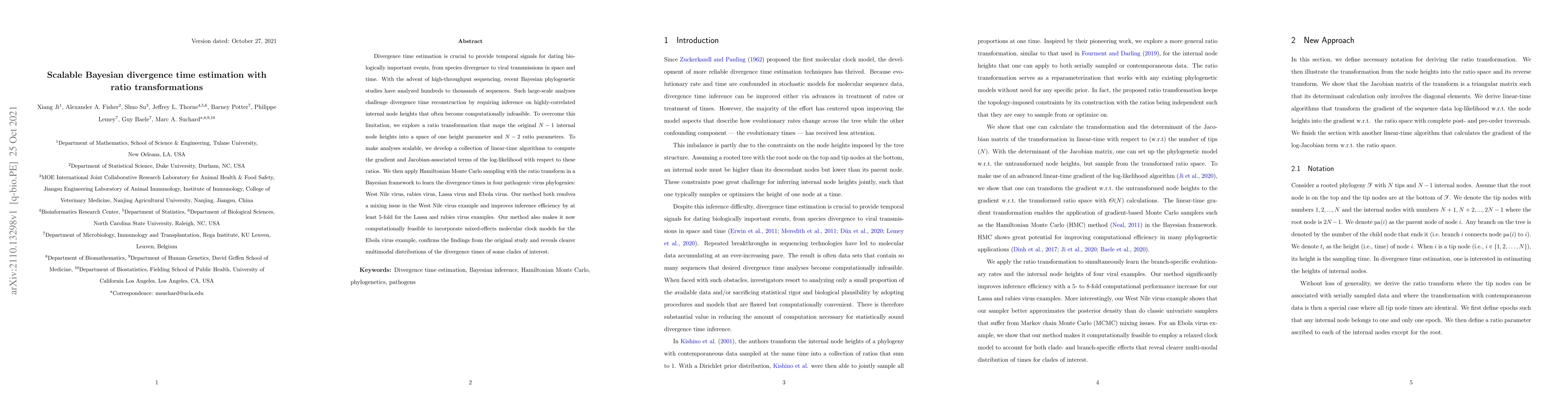 This research introduces a ratio transformation method to address computational challenges in large-scale Bayesian divergence time estimations. The technique reduces dimensionality, enabling faster and more efficient inference for virus phylogenies, such as West Nile, rabies, Lassa, and Ebola viruses, with improved mixing and at least 5-fold efficiency gains.