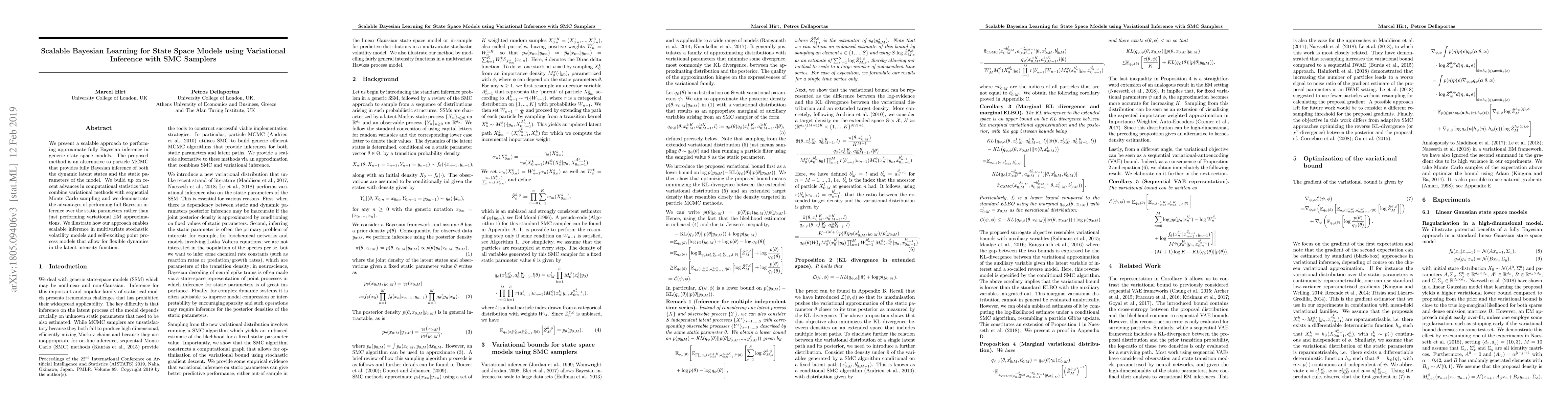 This paper proposes a scalable Bayesian inference method for state space models using variational inference combined with sequential Monte Carlo sampling, offering fully Bayesian inference for both latent states and static parameters. The approach demonstrates advantages over variational EM approximations and enables scalable inference in complex models like multivariate stochastic volatility and self-exciting point processes.