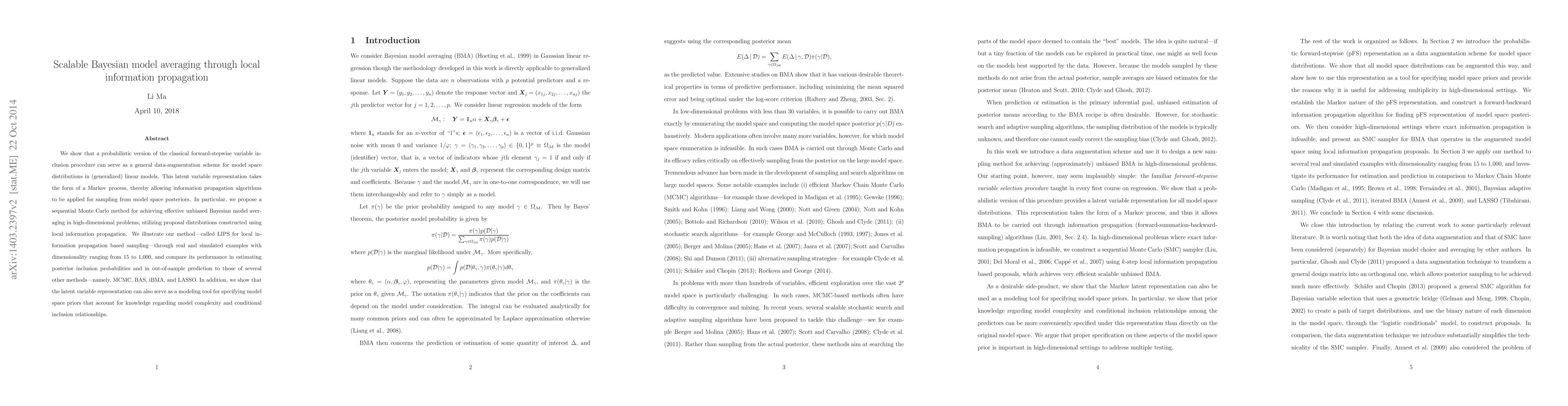 We show that a probabilistic version of the classical forward-stepwise variable inclusion procedure can serve as a general data-augmentation scheme for model space distributions in (generalized) linear models. This latent variable representation takes the form of a Markov process, thereby allowing information propagation algorithms to be applied for sampling from model space posteriors. In particular, we propose a sequential Monte Carlo method for achieving effective unbiased Bayesian model averaging in high-dimensional problems, utilizing proposal distributions constructed using local information propagation. We illustrate our method---called LIPS for local information propagation based sampling---through real and simulated examples with dimensionality ranging from 15 to 1,000, and compare its performance in estimating posterior inclusion probabilities and in out-of-sample prediction to those of several other methods---namely, MCMC, BAS, iBMA, and LASSO. In addition, we show that the latent variable representation can also serve as a modeling tool for specifying model space priors that account for knowledge regarding model complexity and conditional inclusion relationships.