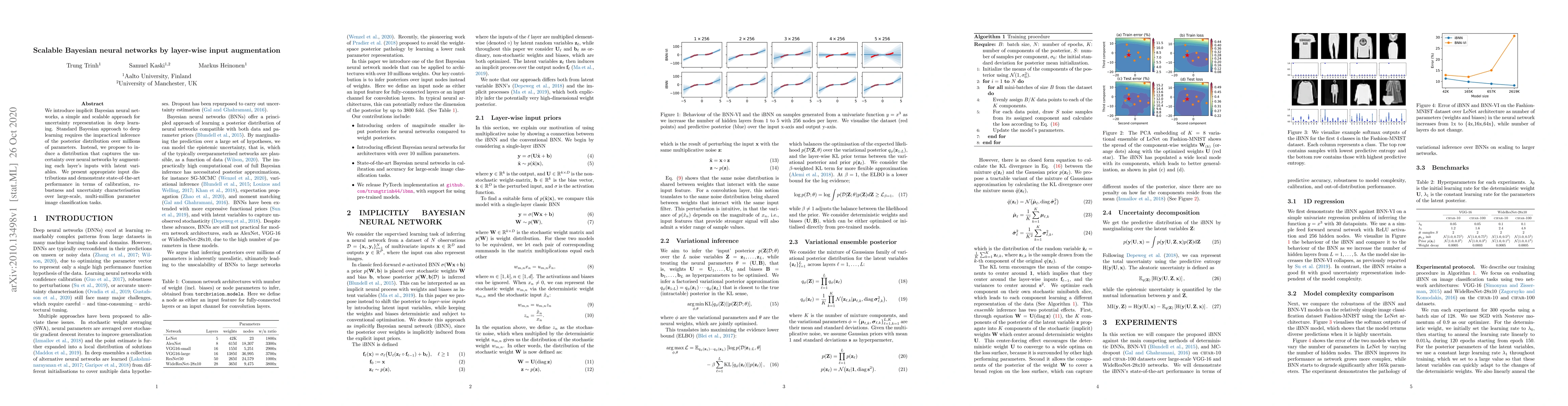 We introduce implicit Bayesian neural networks, a simple and scalable approach for uncertainty representation in deep learning. Standard Bayesian approach to deep learning requires the impractical inference of the posterior distribution over millions of parameters. Instead, we propose to induce a distribution that captures the uncertainty over neural networks by augmenting each layer's inputs with latent variables. We present appropriate input distributions and demonstrate state-of-the-art performance in terms of calibration, robustness and uncertainty characterisation over large-scale, multi-million parameter image classification tasks.