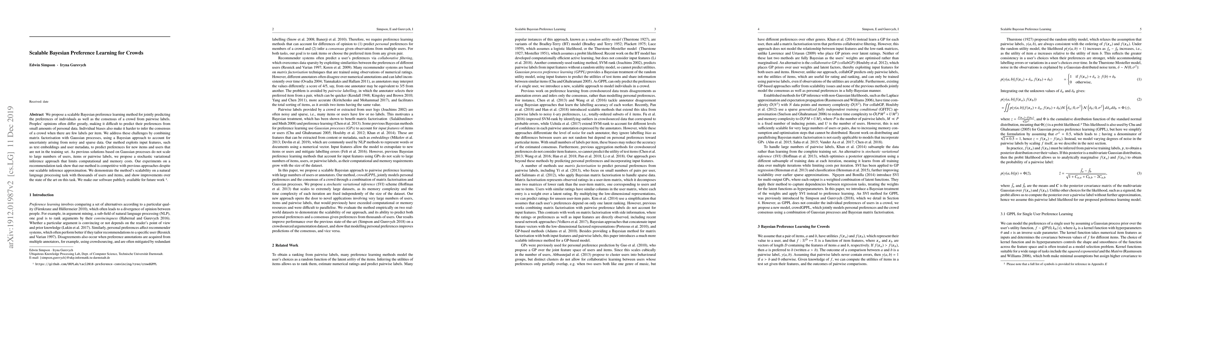 This paper proposes a scalable Bayesian preference learning method combining matrix factorization with Gaussian processes to predict individual preferences and crowd consensus from sparse pairwise labels, using stochastic variational inference to handle large datasets. The method leverages text embeddings and user metadata, demonstrating competitive performance and scalability in recommendation and NLP tasks.