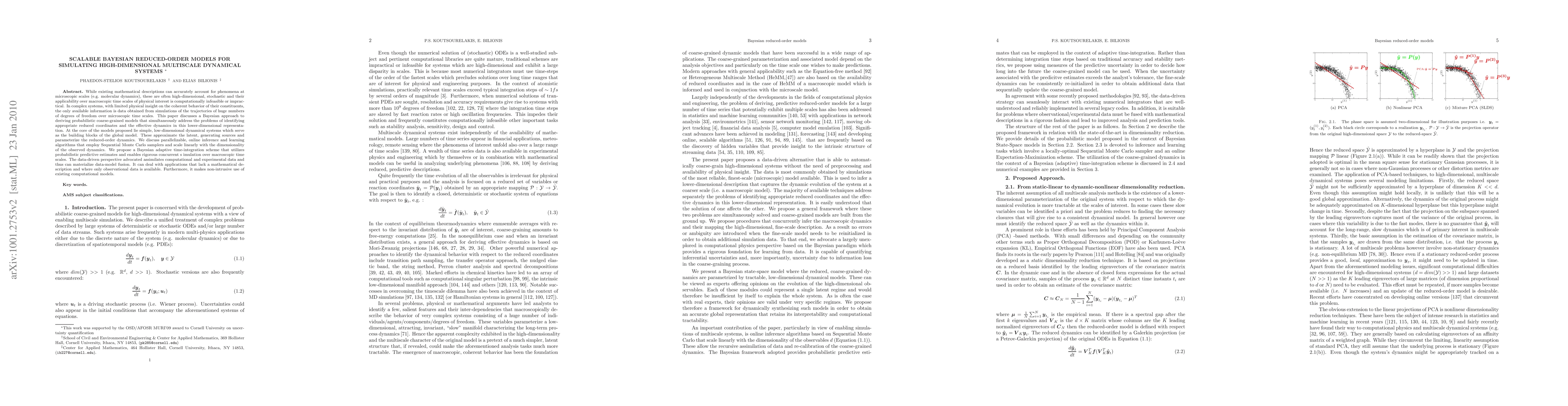 While existing mathematical descriptions can accurately account for phenomena at microscopic scales (e.g. molecular dynamics), these are often high-dimensional, stochastic and their applicability over macroscopic time scales of physical interest is computationally infeasible or impractical. In complex systems, with limited physical insight on the coherent behavior of their constituents, the only available information is data obtained from simulations of the trajectories of huge numbers of degrees of freedom over microscopic time scales. This paper discusses a Bayesian approach to deriving probabilistic coarse-grained models that simultaneously address the problems of identifying appropriate reduced coordinates and the effective dynamics in this lower-dimensional representation. At the core of the models proposed lie simple, low-dimensional dynamical systems which serve as the building blocks of the global model. These approximate the latent, generating sources and parameterize the reduced-order dynamics. We discuss parallelizable, online inference and learning algorithms that employ Sequential Monte Carlo samplers and scale linearly with the dimensionality of the observed dynamics. We propose a Bayesian adaptive time-integration scheme that utilizes probabilistic predictive estimates and enables rigorous concurrent s imulation over macroscopic time scales. The data-driven perspective advocated assimilates computational and experimental data and thus can materialize data-model fusion. It can deal with applications that lack a mathematical description and where only observational data is available. Furthermore, it makes non-intrusive use of existing computational models.
