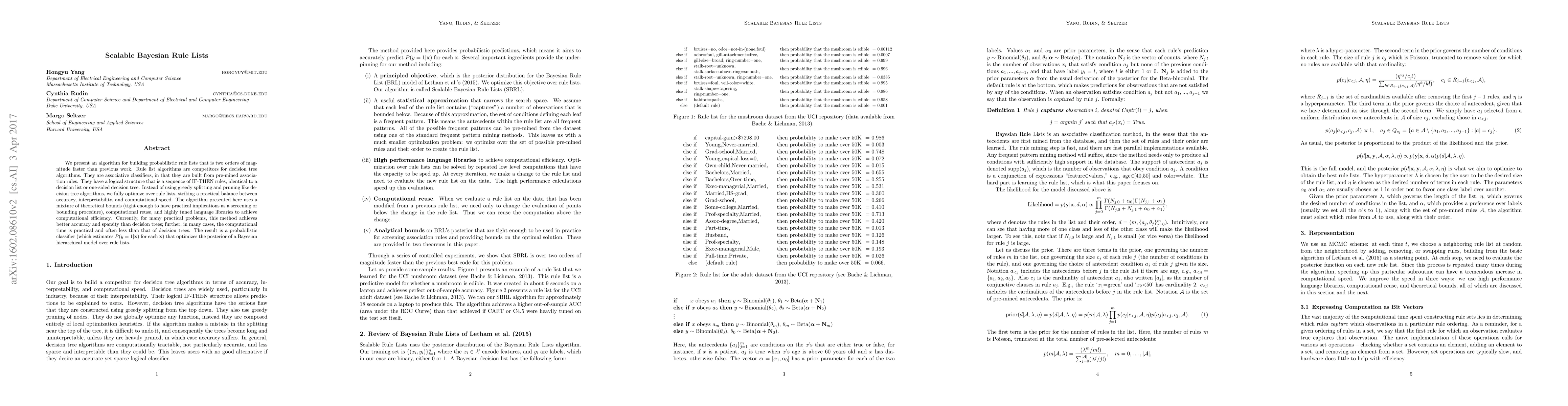 This paper introduces a significantly faster algorithm for constructing scalable probabilistic rule lists compared to previous methods, achieving two orders of magnitude improvement. The new approach optimizes over rule lists for better accuracy and interpretability while maintaining computational efficiency, often outperforming decision trees in accuracy and time.
