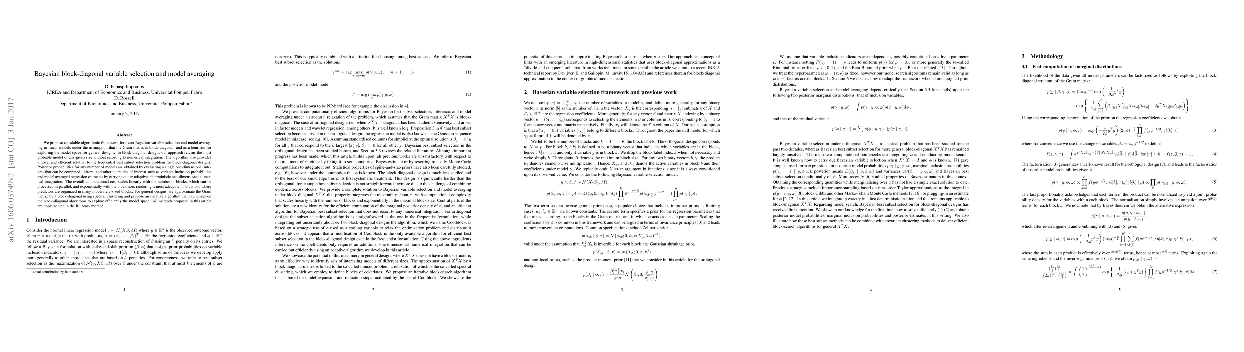 Researchers developed an algorithm for efficient Bayesian variable selection and model averaging in linear models with block-diagonal designs, providing a scalable solution that can handle large datasets.