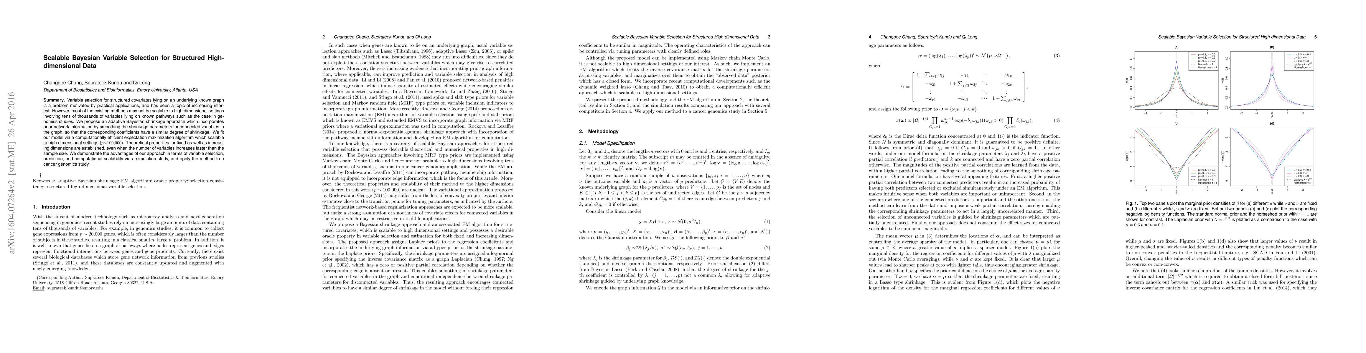 This paper proposes an adaptive Bayesian shrinkage method for scalable variable selection in structured high-dimensional data, incorporating prior network information to ensure similar shrinkage for connected variables. The method is efficiently implemented via an expectation maximization algorithm and demonstrated to be effective in genomics studies.