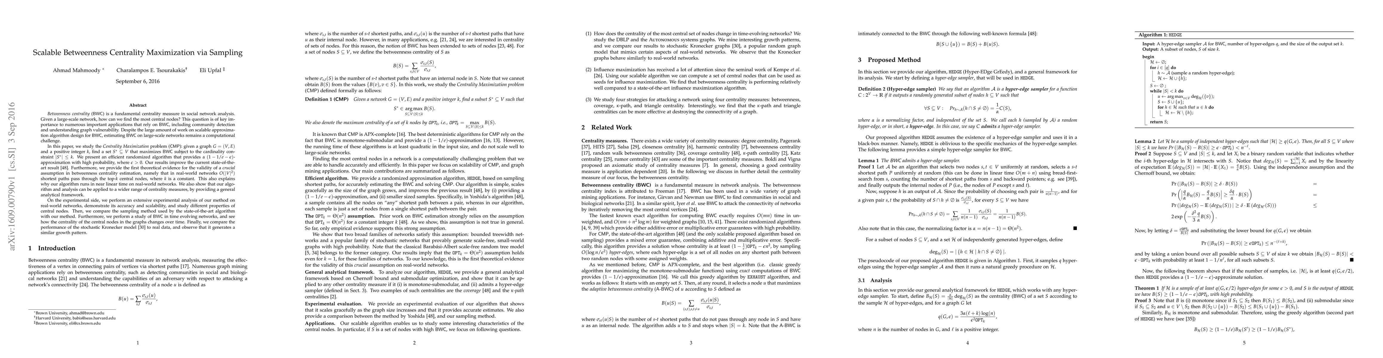 Betweenness centrality is a fundamental centrality measure in social network analysis. Given a large-scale network, how can we find the most central nodes? This question is of key importance to numerous important applications that rely on betweenness centrality, including community detection and understanding graph vulnerability. Despite the large amount of work on designing scalable approximation algorithms for betweenness centrality, estimating it on large-scale networks remains a computational challenge. In this paper, we study the Betweenness Centrality Maximization problem: given a graph $G=(V,E)$ and a positive integer $k$, find a set $S^* \subseteq V$ that maximizes betweenness centrality subject to the cardinality constraint $|S^*| \leq k$. We present an efficient randomized algorithm that provides a $(1-1/e-\epsilon)$-approximation with high probability, where $\epsilon>0$. Our results improve the current state-of-the-art result by Yoshida~\cite{yoshida2014almost}. Furthermore, we provide theoretical evidence for the validity of a crucial assumption in the literature of betweenness centrality estimation, namely that in real-world networks $O(|V|^2)$ shortest paths pass through the top-$k$ central nodes, where $k$ is a constant. On the experimental side, we perform an extensive experimental analysis of our method on real-world networks, demonstrate its accuracy and scalability, and study different properties of central nodes. Finally, we provide three graph mining applications of our method.
