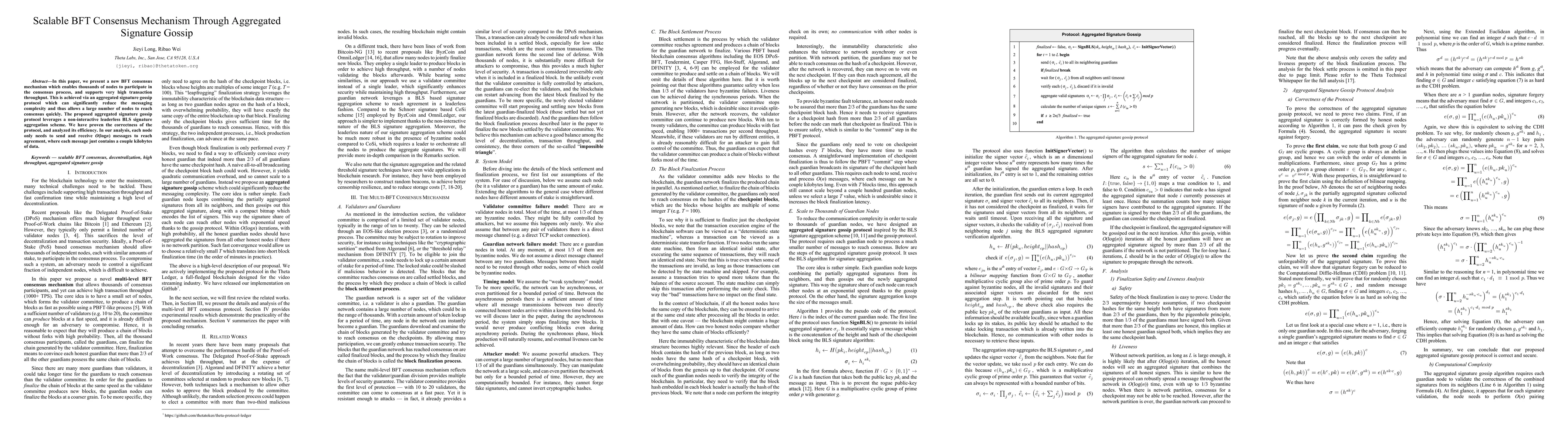 The paper presents a new BFT consensus mechanism using an aggregated signature gossip protocol, leveraging a non-interactive leaderless BLS signature aggregation scheme.