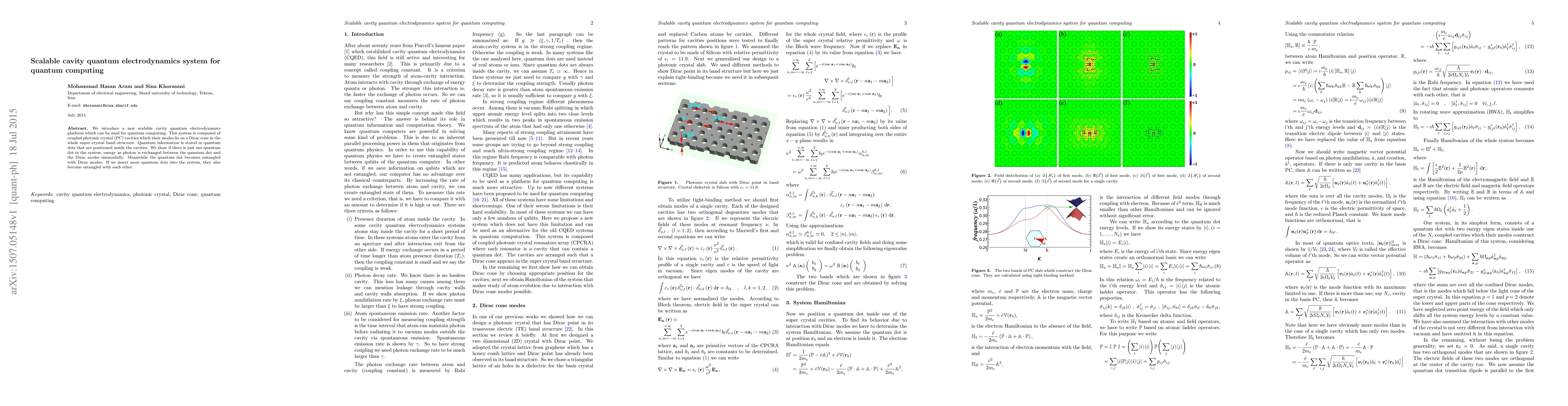 This paper presents a scalable cavity quantum electrodynamics platform for quantum computing using coupled photonic crystal cavities on a Dirac cone, with quantum information stored in quantum dots inside the cavities. The system enables entanglement between quantum dots and Dirac modes, facilitating scalable quantum computing.