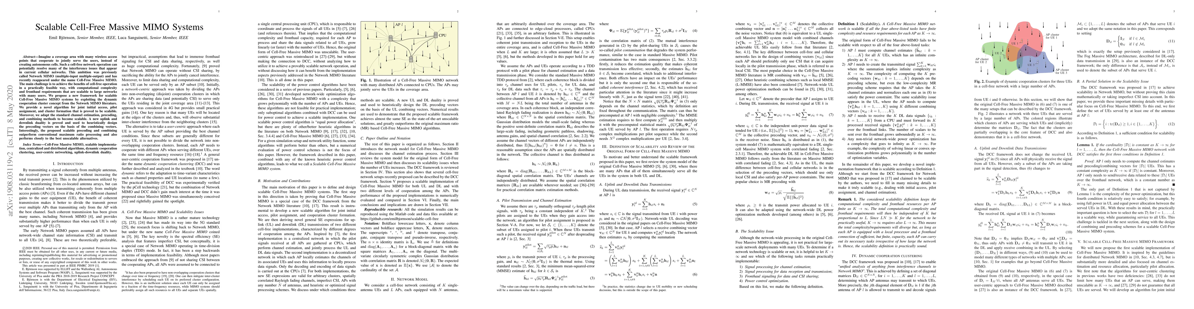 Imagine a coverage area with many wireless access points that cooperate to jointly serve the users, instead of creating autonomous cells. Such a cell-free network operation can potentially resolve many of the interference issues that appear in current cellular networks. This ambition was previously called Network MIMO (multiple-input multiple-output) and has recently reappeared under the name Cell-Free Massive MIMO. The main challenge is to achieve the benefits of cell-free operation in a practically feasible way, with computational complexity and fronthaul requirements that are scalable to large networks with many users. We propose a new framework for scalable Cell-Free Massive MIMO systems by exploiting the dynamic cooperation cluster concept from the Network MIMO literature. We provide a novel algorithm for joint initial access, pilot assignment, and cluster formation that is proved to be scalable. Moreover, we adapt the standard channel estimation, precoding, and combining methods to become scalable. A new uplink and downlink duality is proved and used to heuristically design the precoding vectors on the basis of the combining vectors. Interestingly, the proposed scalable precoding and combining outperform conventional maximum ratio processing and also performs closely to the best unscalable alternatives.
