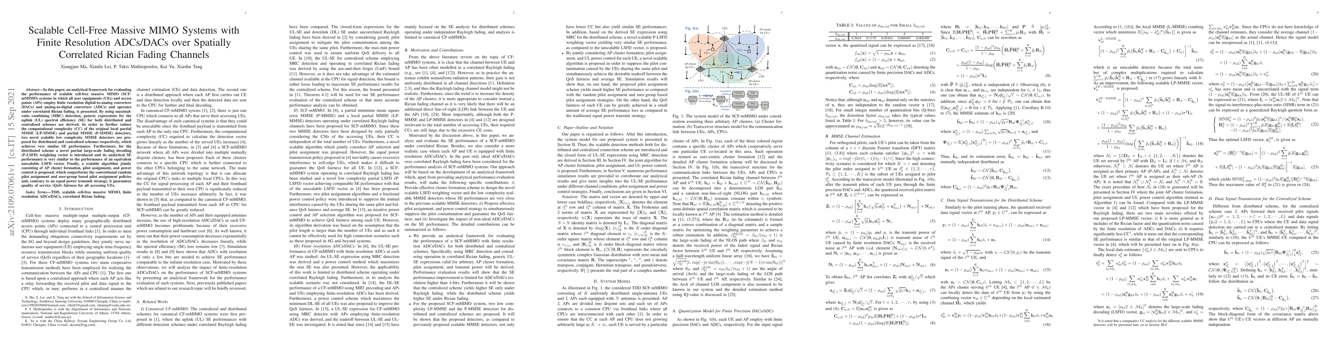 This paper presents an analytical framework for scalable cell-free massive MIMO systems with finite resolution ADCs/DACs under correlated Rician fading channels. It proposes novel low complexity MMSE detectors and a scalable algorithm for AP cluster formation, pilot assignment, and power control, achieving similar spectral efficiency while ensuring QoS fairness.