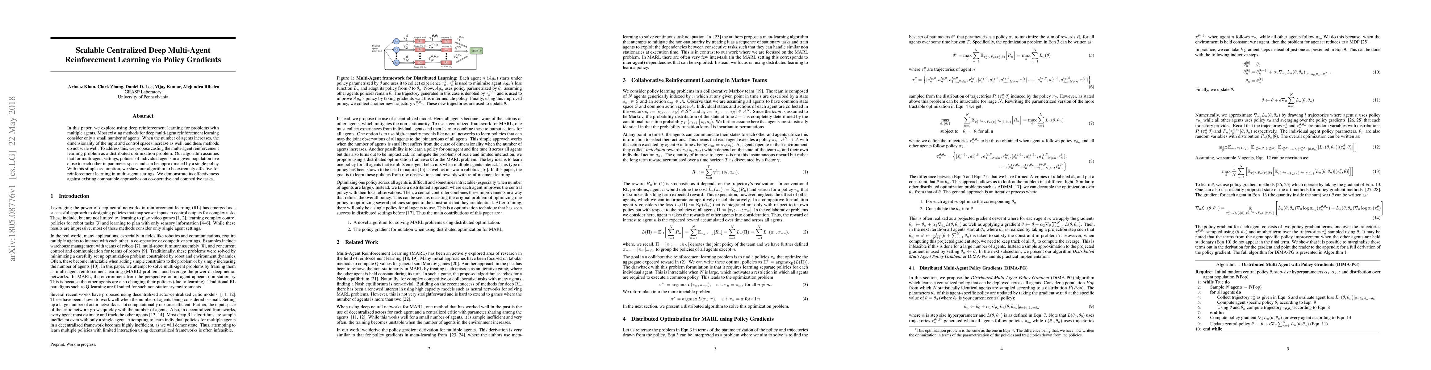 This paper proposes a scalable centralized deep multi-agent reinforcement learning algorithm based on policy gradients, addressing the scalability issue of existing methods for large numbers of agents by using a distributed optimization approach and a single approximating policy. The algorithm is shown to outperform comparable methods in both cooperative and competitive tasks.