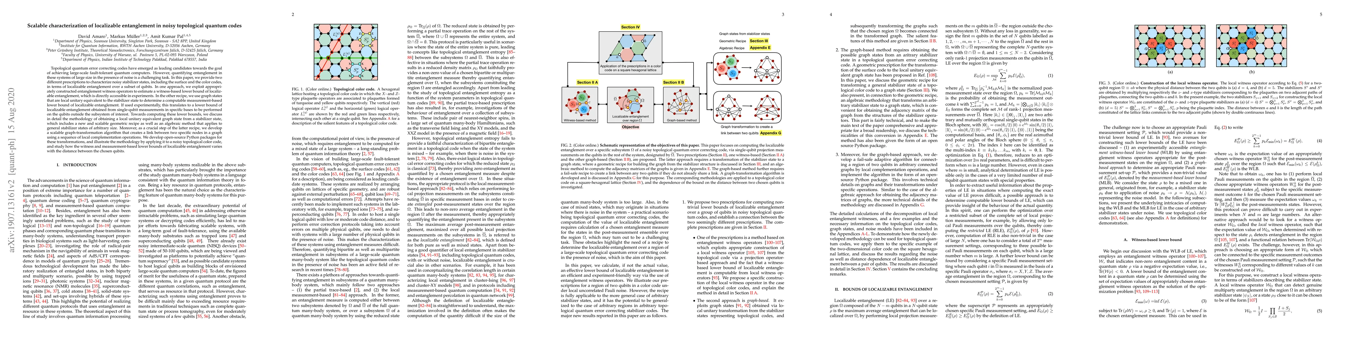 This paper introduces two methods for characterizing localizable entanglement in noisy topological quantum codes, including surface and color codes. It employs entanglement witness operators and measurement-based graph states to estimate lower bounds of localizable entanglement, and develops scalable algorithms and Python packages for practical implementation.