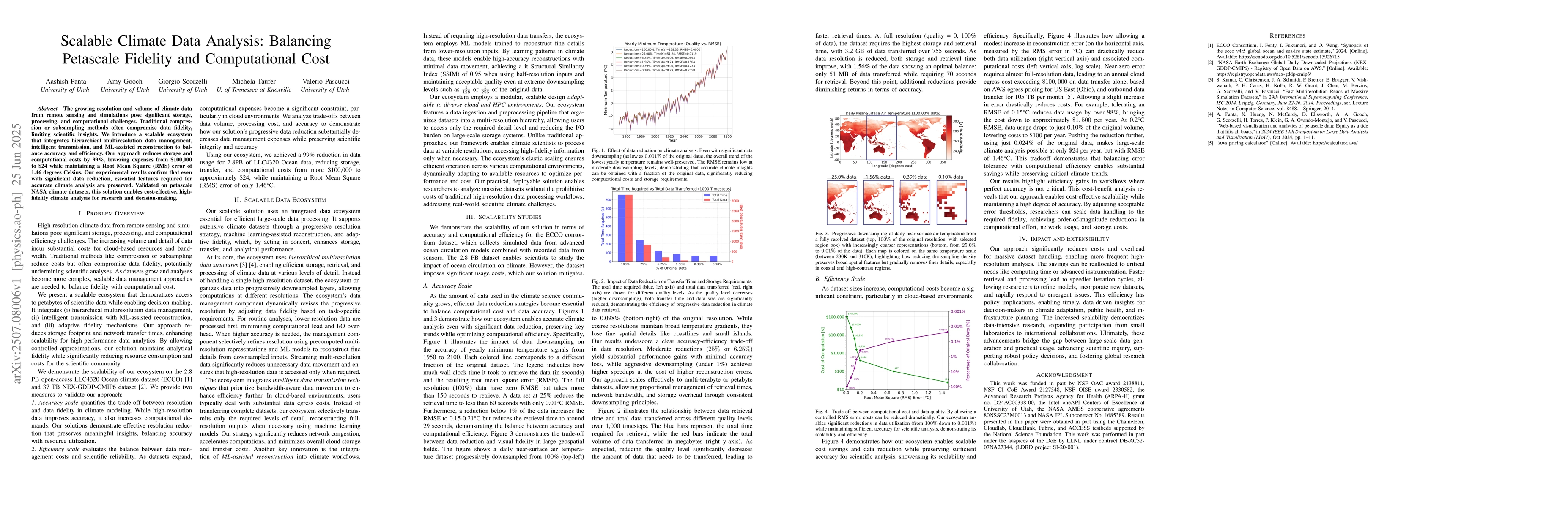 The growing resolution and volume of climate data from remote sensing and simulations pose significant storage, processing, and computational challenges. Traditional compression or subsampling methods often compromise data fidelity, limiting scientific insights. We introduce a scalable ecosystem that integrates hierarchical multiresolution data management, intelligent transmission, and ML-assisted reconstruction to balance accuracy and efficiency. Our approach reduces storage and computational costs by 99\%, lowering expenses from \$100,000 to \$24 while maintaining a Root Mean Square (RMS) error of 1.46 degrees Celsius. Our experimental results confirm that even with significant data reduction, essential features required for accurate climate analysis are preserved. Validated on petascale NASA climate datasets, this solution enables cost-effective, high-fidelity climate analysis for research and decision-making.