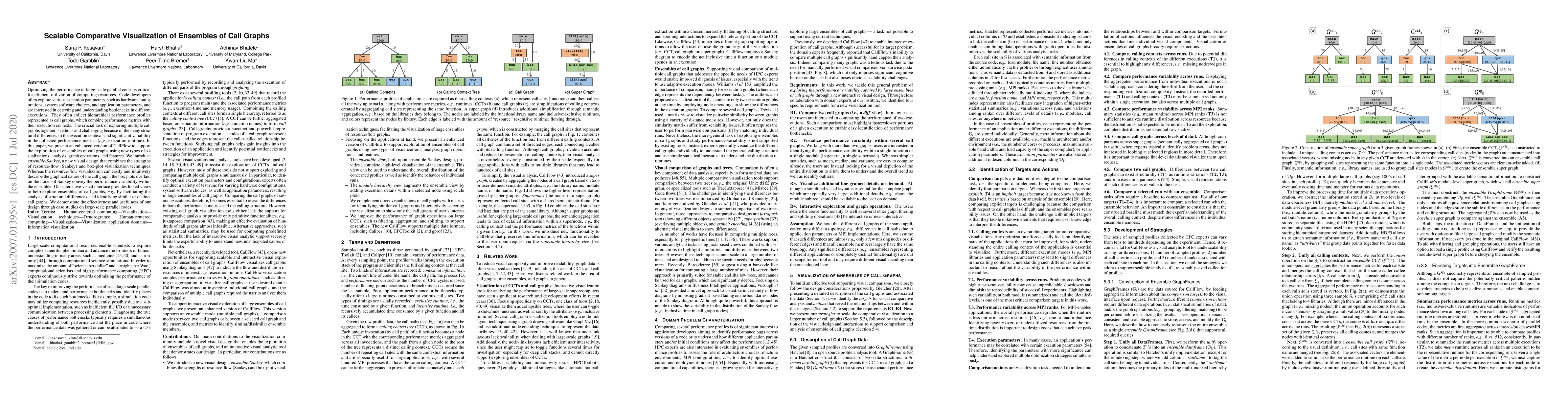 Optimizing the performance of large-scale parallel codes is critical for efficient utilization of computing resources. Code developers often explore various execution parameters, such as hardware configurations, system software choices, and application parameters, and are interested in detecting and understanding bottlenecks in different executions. They often collect hierarchical performance profiles represented as call graphs, which combine performance metrics with their execution contexts. The crucial task of exploring multiple call graphs together is tedious and challenging because of the many structural differences in the execution contexts and significant variability in the collected performance metrics (e.g., execution runtime). In this paper, we present an enhanced version of CallFlow to support the exploration of ensembles of call graphs using new types of visualizations, analysis, graph operations, and features. We introduce ensemble-Sankey, a new visual design that combines the strengths of resource-flow (Sankey) and box-plot visualization techniques. Whereas the resource-flow visualization can easily and intuitively describe the graphical nature of the call graph, the box plots overlaid on the nodes of Sankey convey the performance variability within the ensemble. Our interactive visual interface provides linked views to help explore ensembles of call graphs, e.g., by facilitating the analysis of structural differences, and identifying similar or distinct call graphs. We demonstrate the effectiveness and usefulness of our design through case studies on large-scale parallel codes.