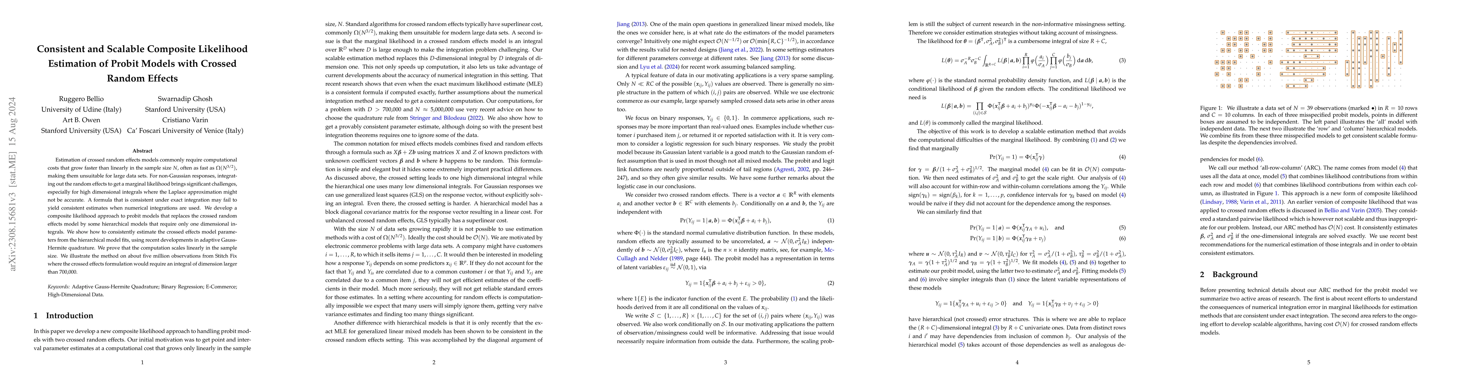 Crossed random effects structures arise in many scientific contexts. They raise severe computational problems with likelihood computations scaling like $N^{3/2}$ or worse for $N$ data points. In this paper we develop a new composite likelihood approach for crossed random effects probit models. For data arranged in R rows and C columns, the likelihood function includes a very difficult R + C dimensional integral. The composite likelihood we develop uses the marginal distribution of the response along with two hierarchical models. The cost is reduced to $\mathcal{O}(N)$ and it can be computed with $R + C$ one dimensional integrals. We find that the commonly used Laplace approximation has a cost that grows superlinearly. We get consistent estimates of the probit slope and variance components from our composite likelihood algorithm. We also show how to estimate the covariance of the estimated regression coefficients. The algorithm scales readily to a data set of five million observations from Stitch Fix with $R + C > 700{,}000$.