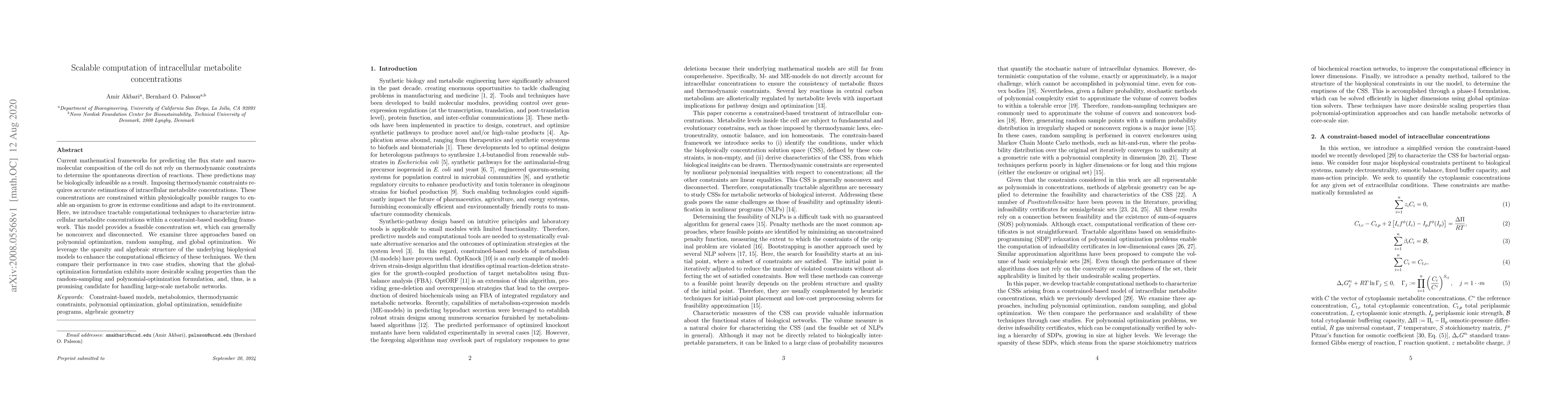 This paper presents scalable computational methods for estimating intracellular metabolite concentrations within thermodynamic constraints, addressing limitations in current predictive models. The authors compare global optimization, polynomial optimization, and random sampling techniques, finding that global optimization scales better for large metabolic networks.