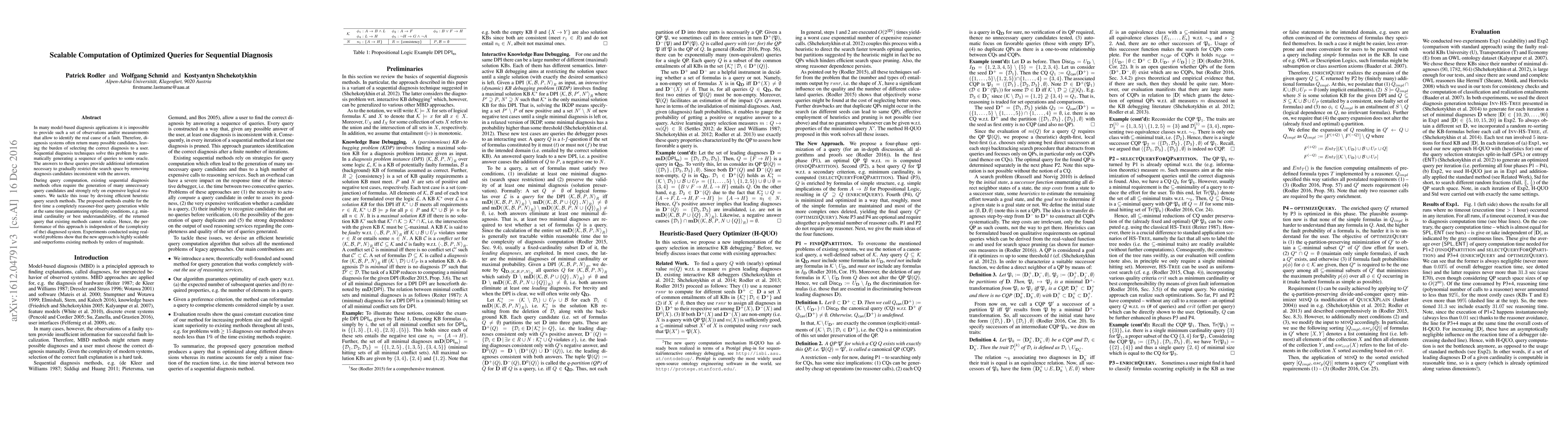 This paper proposes efficient heuristic query search methods for scalable sequential diagnosis, enabling reasoner-free query generation while guaranteeing optimal query conditions. Experimental results demonstrate significant performance improvements over existing methods.
