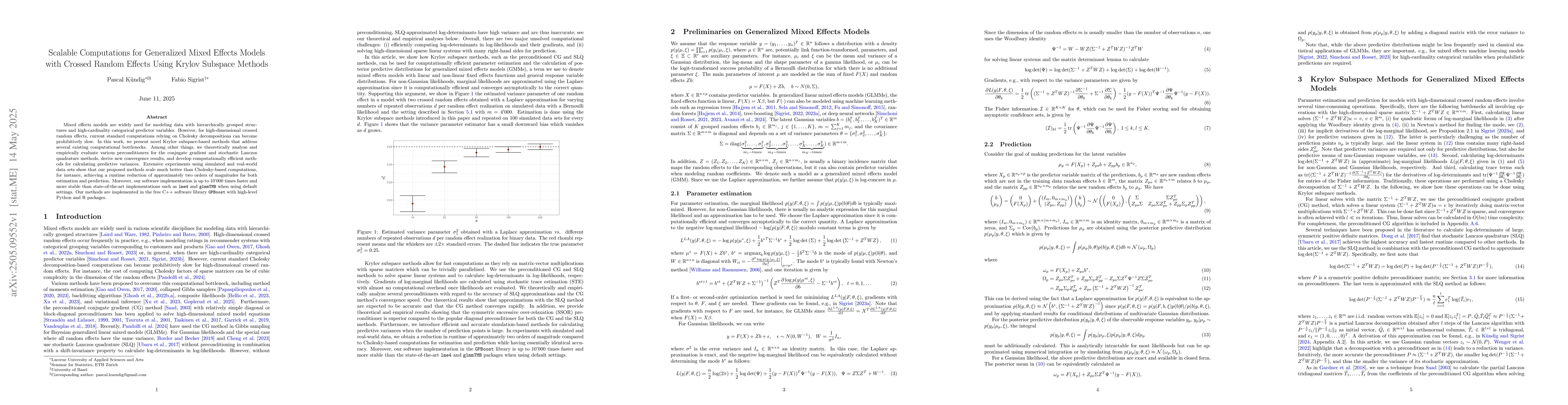 The research presents novel Krylov subspace-based methods to address computational bottlenecks in mixed effects models with high-dimensional crossed random effects, analyzing preconditioners for CG and SLQ methods and deriving new convergence results.