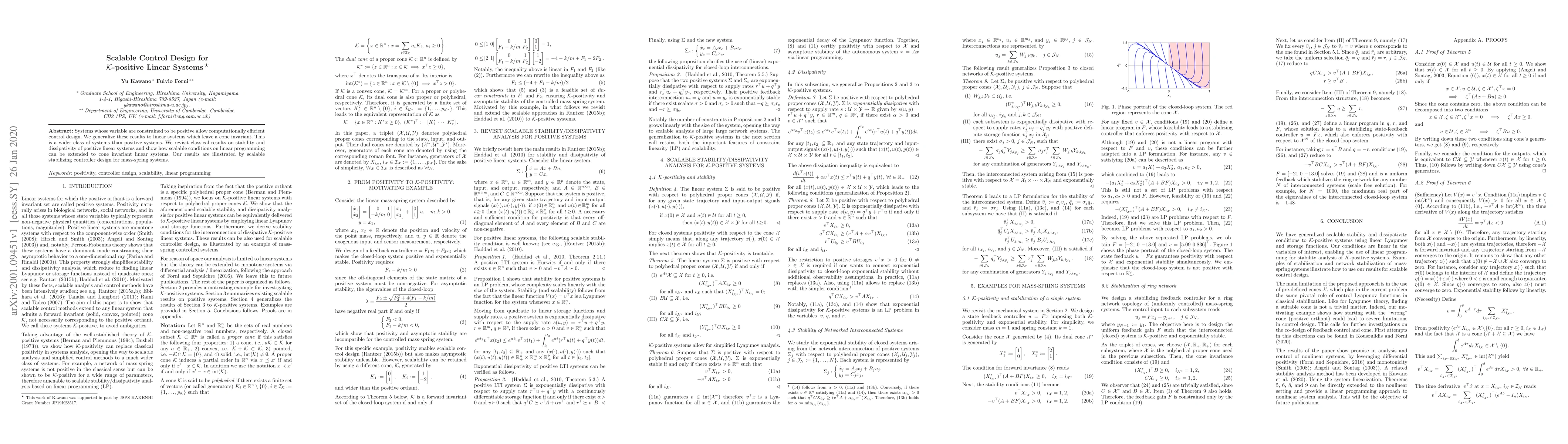 This paper generalizes scalable control design for positive linear systems to a broader class of cone invariant linear systems, extending classical stability and dissipativity results through linear programming. The approach is demonstrated via scalable stabilizing controllers for mass-spring systems.