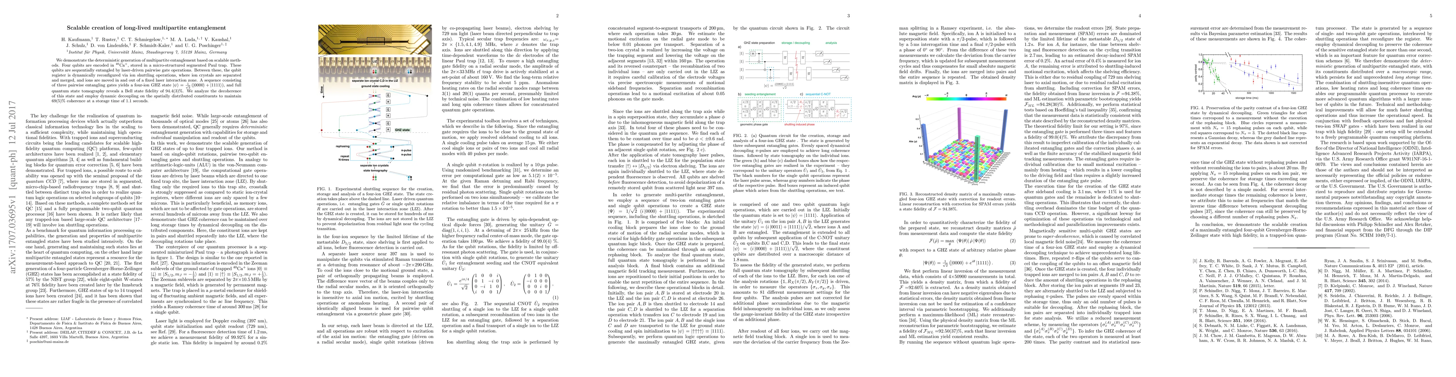 We demonstrate the deterministic generation of multipartite entanglement based on scalable methods. Four qubits are encoded in $^{40}$Ca$^+$, stored in a micro-structured segmented Paul trap. These qubits are sequentially entangled by laser-driven pairwise gate operations. Between these, the qubit register is dynamically reconfigured via ion shuttling operations, where ion crystals are separated and merged, and ions are moved in and out of a fixed laser interaction zone. A sequence consisting of three pairwise entangling gates yields a four-ion GHZ state $\vert\psi\rangle=\tfrac{1}{\sqrt{2}}\left(\vert 0000\rangle+\vert 1111\rangle\right)$, and full quantum state tomography reveals a Bell state fidelity of 94.4(3)\%. We analyze the decoherence of this state and employ dynamic decoupling on the spatially distributed constituents to maintain 69(5)\% coherence at a storage time of 1.1~seconds.