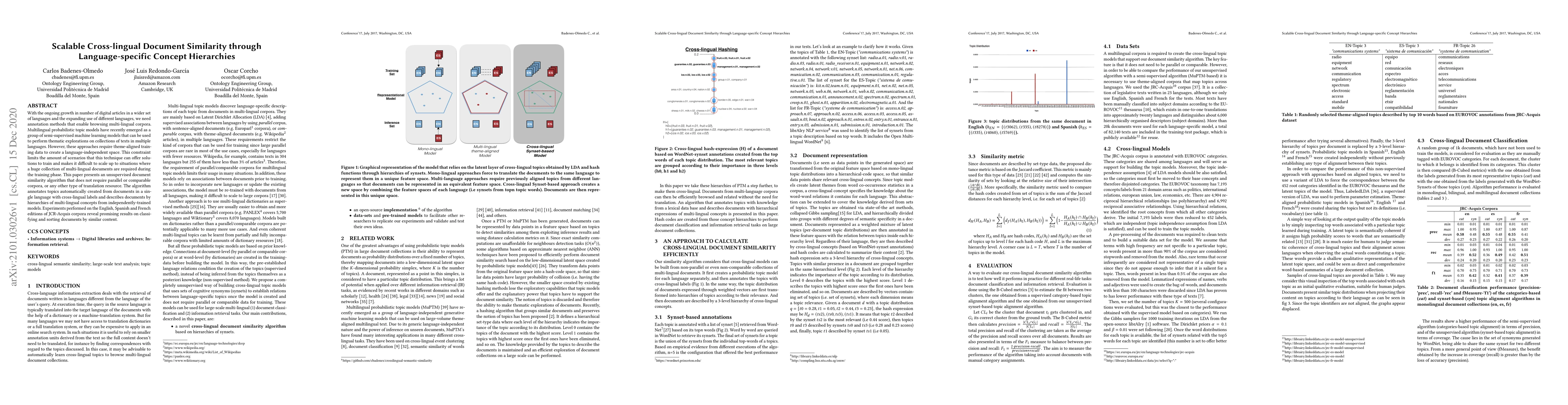 With the ongoing growth in number of digital articles in a wider set of languages and the expanding use of different languages, we need annotation methods that enable browsing multi-lingual corpora. Multilingual probabilistic topic models have recently emerged as a group of semi-supervised machine learning models that can be used to perform thematic explorations on collections of texts in multiple languages. However, these approaches require theme-aligned training data to create a language-independent space. This constraint limits the amount of scenarios that this technique can offer solutions to train and makes it difficult to scale up to situations where a huge collection of multi-lingual documents are required during the training phase. This paper presents an unsupervised document similarity algorithm that does not require parallel or comparable corpora, or any other type of translation resource. The algorithm annotates topics automatically created from documents in a single language with cross-lingual labels and describes documents by hierarchies of multi-lingual concepts from independently-trained models. Experiments performed on the English, Spanish and French editions of JCR-Acquis corpora reveal promising results on classifying and sorting documents by similar content.
