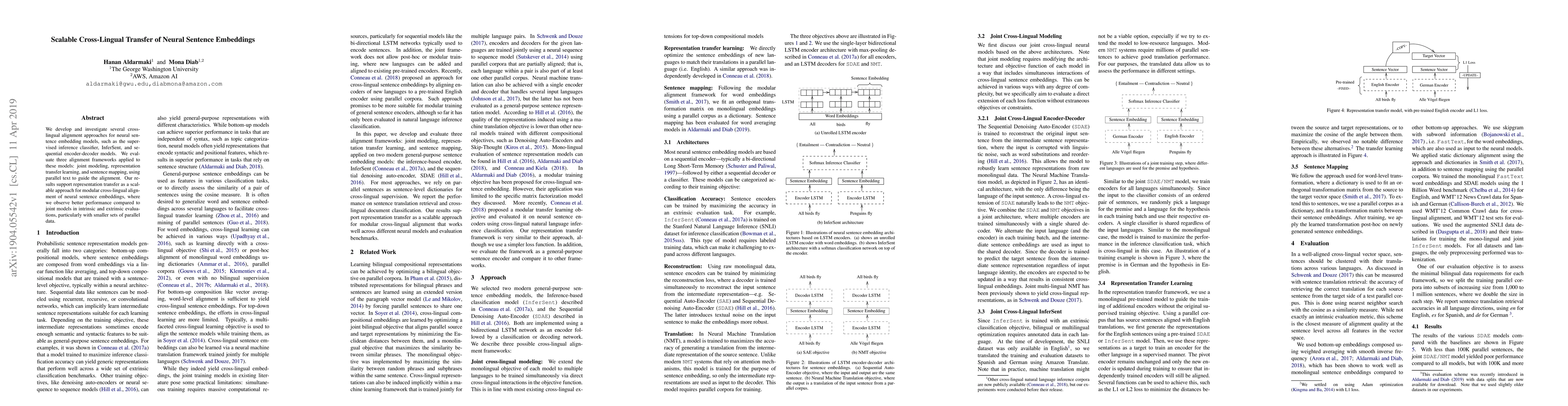 This paper develops cross-lingual alignment methods for neural sentence embeddings, comparing joint modeling, transfer learning, and sentence mapping. Representation transfer learning shows better performance, especially with limited parallel data, making it a scalable solution for cross-lingual alignment.